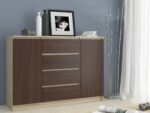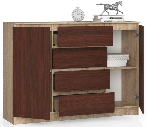 Mūsų internetinėje parduotuvėje už konkurencingą kainą rasite didelę, labai įspūdingą komodą, kuri yra sonoma ąžuolo ir venge spalvų derinys. Tai kokybiškas baldas, skirtas klientams, ieškantiems funkcionalios, talpios ir universalios komodos. Nesenstantis pasiūlymo pobūdis garantuoja, kad jis ilgai atrodys gražiai bet kurioje patalpoje – tiek modernioje, tiek klasikinėje. 140 cm pločio komodoje yra keturi erdvūs stalčiai ir dvi uždaros spintelės. Baldai skirti montuoti savarankiškai, komplekte yra instrukcija. Lengva naudoti kasdien, tvirta, o puikiai atrodančiam mūsų parduotuvės pasiūlymui taikoma 24 mėnesių garantija. – Komoda pagaminta iš aukštos kokybės 16 mm laminuota plokštė, atspari dilimui, gamintojas kronospan – Stalčių fasadai pagaminti iš laminuotos plokštės – Stalčiai juda ant metalinių ritinėlių kreiptuvų – Kraštai padengti ABS briauna, užtikrinančia aukštą apsaugą nuo pažeidimų p> – Kiekvienos viduje yra po vieną lentyną nuo durų – Savarankiškai surenkama komoda – Instrukcija pridedama – Garantija 24 mėn.