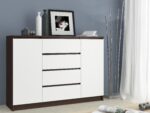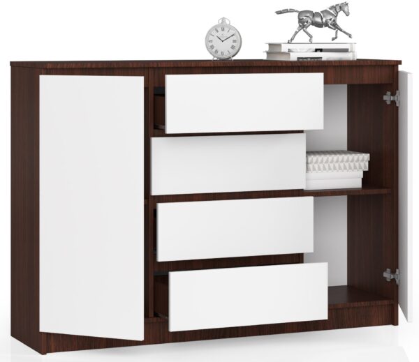 Komoda K140 su 2 durelėmis ir 4 stalčiais pagaminta iš aukščiausios kokybės Kronospan gaminamos 16 mm dilimui atsparios laminuotos plokštės. Apsauga nuo bet kokių pažeidimų užtikrinama baldo kraštus apklijuojant ABS apvadu. Dėmesingumo kiekvienai smulkmenai dėka komoda puikiai atlieka savo naudingąsias funkcijas, tuo pačiu suteikia kambariui elegancijos. instrukcijos ir atskirų elementų žymėjimas baldų. Tai leidžia maloniai ir praktiškai be įrankių surinkti. Sulenkta komoda yra šių matmenų: – 138 cm ilgio, – 99 cm aukščio, – 40 cm gylio. Baldai pagaminti naudojant CLP Baldų sistema. Tai sistema, kurią sudaro platus svetainės ir miegamojo baldų asortimentas, skirtas efektyviai sutvarkyti namus už mažą kainą. Jūsų patogumui ir patogus sandėliavimas, komoda suprojektuota taip, kad vidurinėje dalyje yra 4 stalčiai, einantys ant metalinių bėgelių, o šoninės dalys slepia vieną lentyną už durelių. Visi fasadai pagaminti iš laminuotos plokštės Komoda yra wenge spalvos su baltais priekiais. Kintamų spalvų naudojimas leidžia priderinti baldus prie bet kokio kambario ir išdėstymo. Vadovaudamiesi filosofija – rūpintis klientų poreikiais ir pasitenkinimu mūsų gaminiais, komodai suteikiama 24 mėnesių garantija. – Komoda pagaminta iš aukštos kokybės 16 mm laminuotos plokštės, atspari dilimui, kronospan gamintojas – Stalčių fasadai pagaminti iš laminuotos plokštės – Stalčiai juda ant metalinių ritinėlių kreiptuvų – Kraštai padengti ABS briauna, užtikrinančia aukštą apsaugą nuo pažeidimų – Kiekvienoje viduje yra po vieną lentyną durys – Komoda, skirta savarankiškai surinkti – Pristatymo vadovas – Garantija 24 mėn.