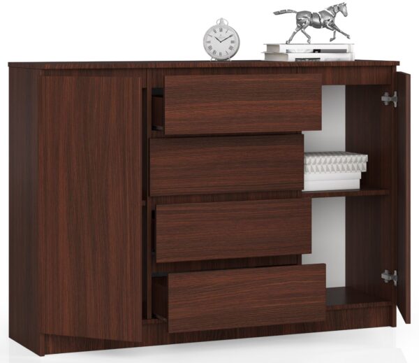 Graži ir funkcionali – tai komoda K140. Jo skoninga spalva – wenge vis dar madinga – o ergonomiškas ir estetiškas dizainas paverčia baldu, kuris puikiai tiks miegamajame, svetainėje ar prieškambaryje. Puikiai apgalvotas komodos dizainas suteikia daug vietos daiktams susidėti. Dviejų spintelių su lentynomis ir keturių stalčių, judančių ant metalinių ritinėlių kreiptuvų, dėka jame tilps daug kasdienių daiktų, o ant erdvaus stalviršio puikiai atrodys šeimos suvenyrai, dekoracijos ar aksesuarai, kuriuos verta turėti po ranka. Medžiaga, iš kurios pagaminta pristatoma komoda, yra firmos Kronospan laminuota plokštė. Jis yra 16 mm storio ir itin atsparus dilimui. Jo matomos briaunos padengtos ABS briauna – šio metodo naudojimas leidžia baldams būti itin atspariems mechaniniams pažeidimams. Komoda K140 yra stabili, talpi ir lengvai valoma. Pristatomas baldas skirtas montuoti savarankiškai. Komplekte yra jo vadovas. „Akord“ internetinėje baldų parduotuvėje įsigytai komodai suteikiama 24 mėnesių garantija. – Komoda iš aukštos kokybės 16 mm dilimui atsparios laminuotos plokštės, gamintojas kronospan – Stalčių fasadai pagaminti iš laminuotos lentos – Stalčiai juda ant metalinių ritinėlių kreiptuvų – Kraštai padengti ABS briauna, kad būtų apsaugota nuo pažeidimų – Kiekvienoje viduje yra po vieną lentyną durys – Komoda, skirta savarankiškai surinkti – Instrukcija pridedama – Garantija 24 mėn.