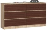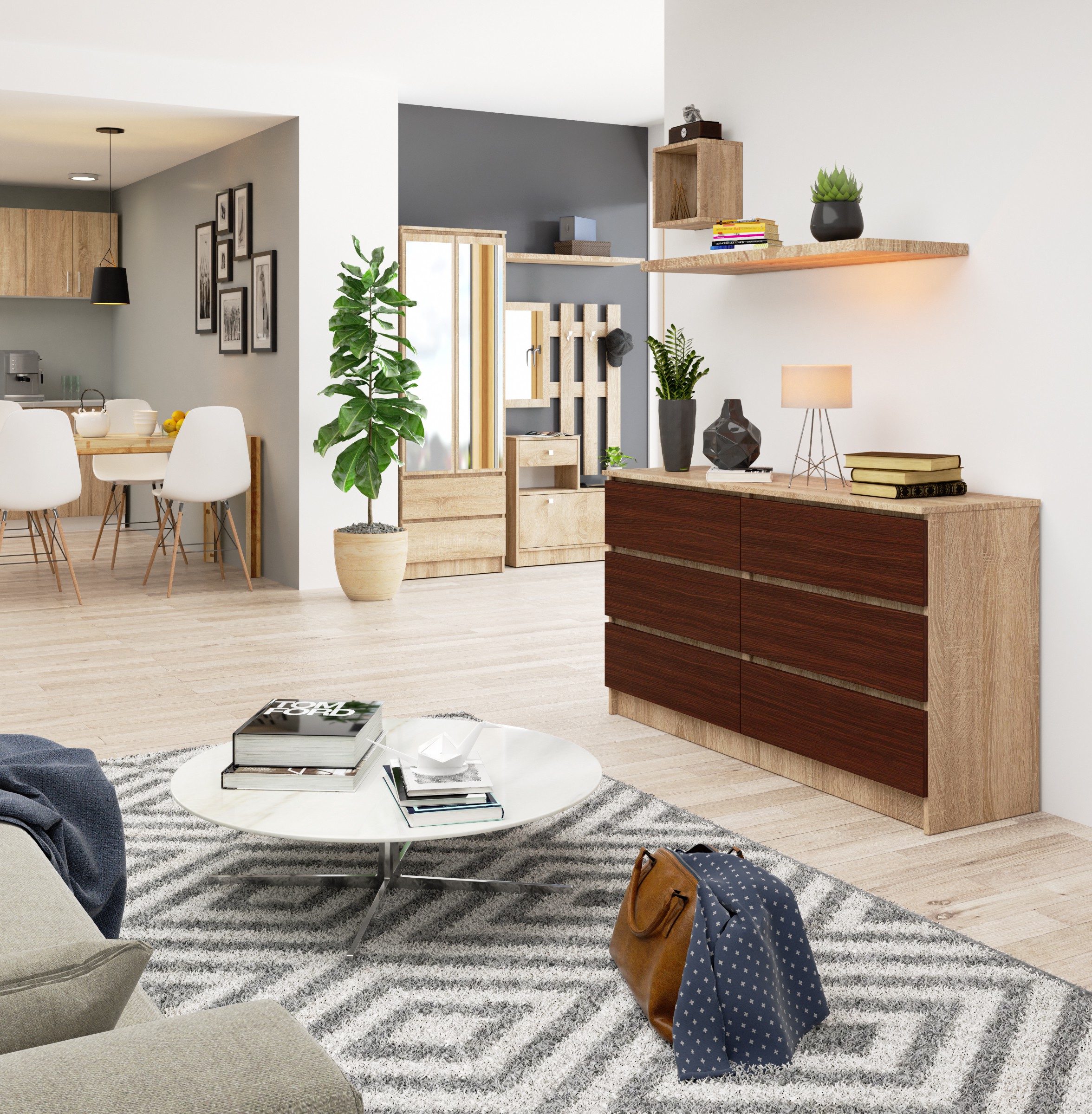 Plati komoda yra dviejų klasikinio grožio medžio atspalvių, venge ir sonoma, derinys. Šios spalvos pastaraisiais metais buvo labai populiarios, kurios ne veltui yra labai populiarios tarp mūsų internetinės parduotuvės klientų. Jei ieškote funkcionalios ir kokybiškos komodos – atėjote ten, kur reikia. Baldai susideda iš šešių stalčių, pagamintų iš patvarios laminuotos plokštės – medžiagos, atsparios dilimui ir pažeidimams. Komoda yra praktiška įranga, puikiai tinkanti gyvenamosiose patalpose ir kitose gyvenamosiose bei biuro patalpose. Lengvai naudojamas ir švarus šis baldas tikrai pateisins klientų, vertinančių gerą pasirinktų gaminių kainos ir kokybės santykį, lūkesčius. – Komoda iš dilimui atspari laminuota plokštė – Stalčių fasadai pagaminti iš laminuotos plokštės – Stalčiai eina ant metalinių ritinėlių kreiptuvų – Kraštai padengti ABS apvadu, užtikrinančiu aukšta apsauga nuo pažeidimų – Savarankiškai surenkama komoda – Instrukcija pridedama – Garantija 24 mėn.