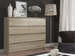 Pateiktas baldas tikrai puikiai tiks tiek svetainėje, tiek miegamajame, valgomajame ar namų biure. Komoda K140 su aštuoniais stalčiais taip pat bus praktiškas sprendimas bet kuriame biuro interjere. Būdingi šio pasiūlymo bruožai visų pirma yra madinga sonomos ąžuolo spalva, funkcionalumas ir tvirtas apdirbimas. Iš 16 milimetrų storio laminuotos plokštės pagamintas baldas, pasižymintis atsparumu dilimui, tikrai patiks žmonėms, mėgstantiems praktiškai sutvarkytas, modernias erdves. Didelė komoda už konkurencingą kainą turėtų atitikti visų klientų, vertinančių gerą žemos kainos ir aukštos pasirinktų gaminių kokybės santykį, reikalavimus. Baldus lengva valyti, jie puikiai dera su visais priedais. – Komoda pagaminta iš dilimui atsparios laminuotos plokštės – Stalčių fasadai iš laminuotos lenta – Stalčiai juda ant metalinių ritinėlių kreiptuvų – Kraštai padengti ABS briauna, užtikrinančia aukštą apsaugą nuo pažeidimų – Savarankiškai surenkama komoda – Instrukcija pridedama – 24 mėnesių garantija