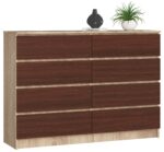 140 cm pločio komoda yra puikus pasiūlymas biure ar didelėje svetainėje. Baldai pasižymi tvirta konstrukcija ir kruopščiu apdirbimu iš geros kokybės medžiagos – 16 milimetrų storio laminuotos plokštės. Tai medžiaga, kuri išsiskiria ilgaamžiškumu ir dideliu atsparumu dilimui. Komodos mūsų internetinėje parduotuvėje yra prieinamos patraukliomis kainomis. Visų pirma orientuojamės į siūlomų gaminių funkcionalumą, todėl siūlome baldą, susidedantį iš net aštuonių erdvių stalčių, judančių ant metalinių ritinėlių kreiptuvų. Komoda skirta montuoti savarankiškai ir jai suteikiama dvejų metų garantija. Tikimės, kad produktas, kuris yra dviejų madingų spalvų derinys, tiks jūsų išdėstymui. – Komoda iš dilimui atsparios laminuotos plokštės – Stalčių fasadai pagaminti iš laminuotos plokštės – Stalčiai juda ant metalinių ritinėlių kreiptuvų – Kraštai padengti ABS apvadu, užtikrinančiu aukštą apsaugą nuo pažeidimų – Savarankiškai surenkama komoda – Instrukcija pridedama – Garantija 24 mėn.