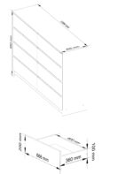– Komodos korpusas pagamintas iš laminuotos plokštės balto kilimėlio, atsparus dilimui 16 mm – Priekiniai skydai pagaminti iš 19 mm AKRYL plokštės su blizgiu metaliniu dekoru – Stalčiai juda ant metalinių ritinėlių kreiptuvų – Kraštai padengti ABS briauna, užtikrinančia aukštą apsaugą nuo pažeidimų – Savarankiškai surenkama komoda – Pristatyme pateikiamos instrukcijos – 24 mėnesių garantija