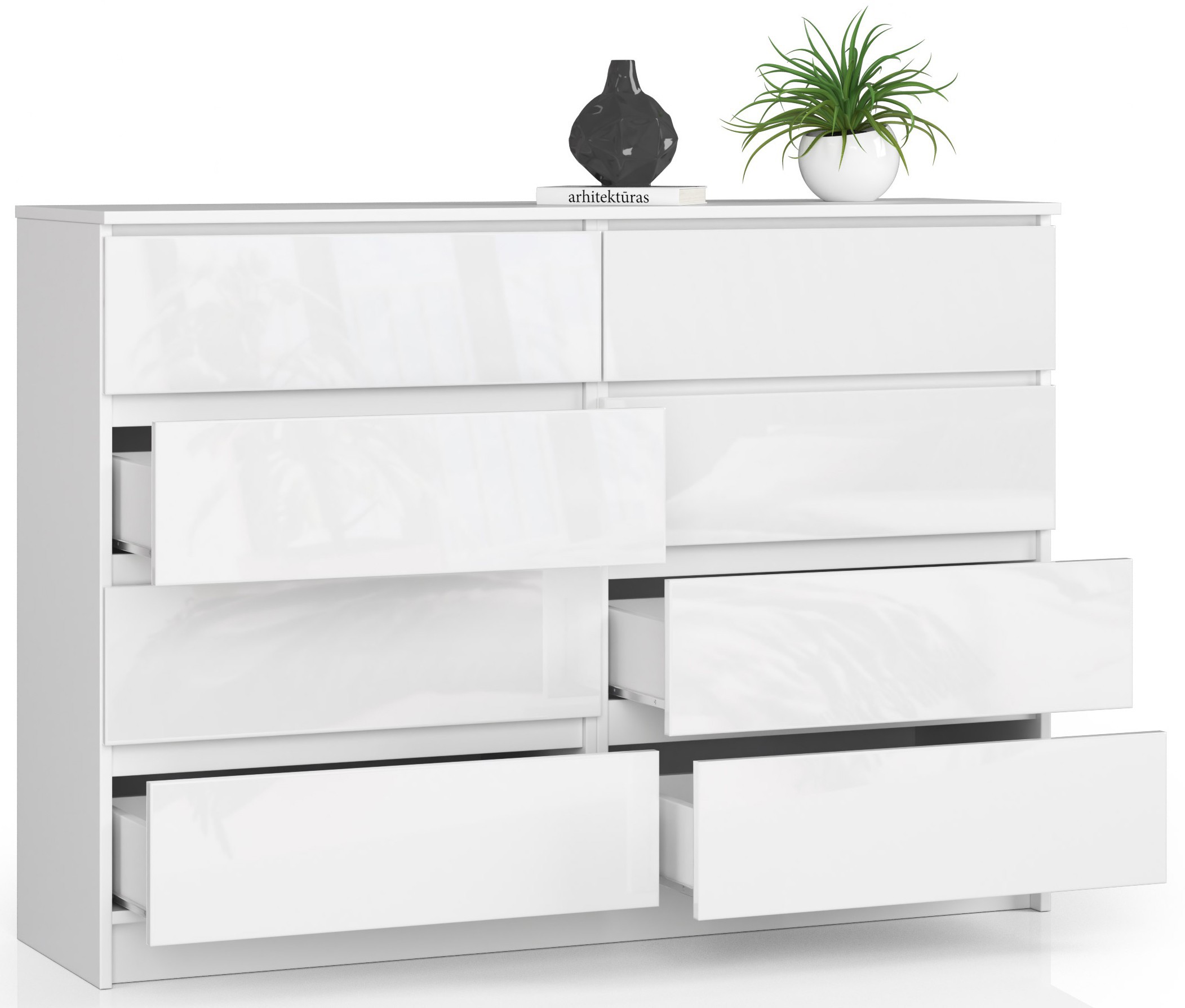 – Komodos korpusas pagamintas iš laminuotos plokštės balto kilimėlio, atsparus dilimui 16 mm – Priekiniai skydai pagaminti iš 19 mm akrilo lentos su baltu blizgiu dekoru – Stalčiai juda ant metalinių ritinėlių kreiptuvų – Kraštai padengti ABS briauna, užtikrinančia aukštą apsaugą nuo pažeidimų – Savarankiškai surenkama komoda – Pristatyme pateikiamos instrukcijos – 24 mėnesių garantija