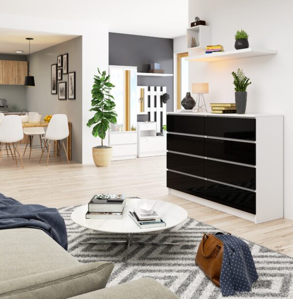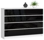 – Komodos korpusas pagamintas iš laminuotos plokštės balto kilimėlio, atsparus dilimui 16 mm – Priekiniai skydai pagaminti iš 19 mm akrilo lentos su juodu blizgiu dekoru – Stalčiai juda ant metalinių ritinėlių kreiptuvų – Kraštai padengti ABS briauna, užtikrinančia aukštą apsaugą nuo pažeidimų – Savarankiškai surenkama komoda – Pristatyme pateikiamos instrukcijos – 24 mėnesių garantija