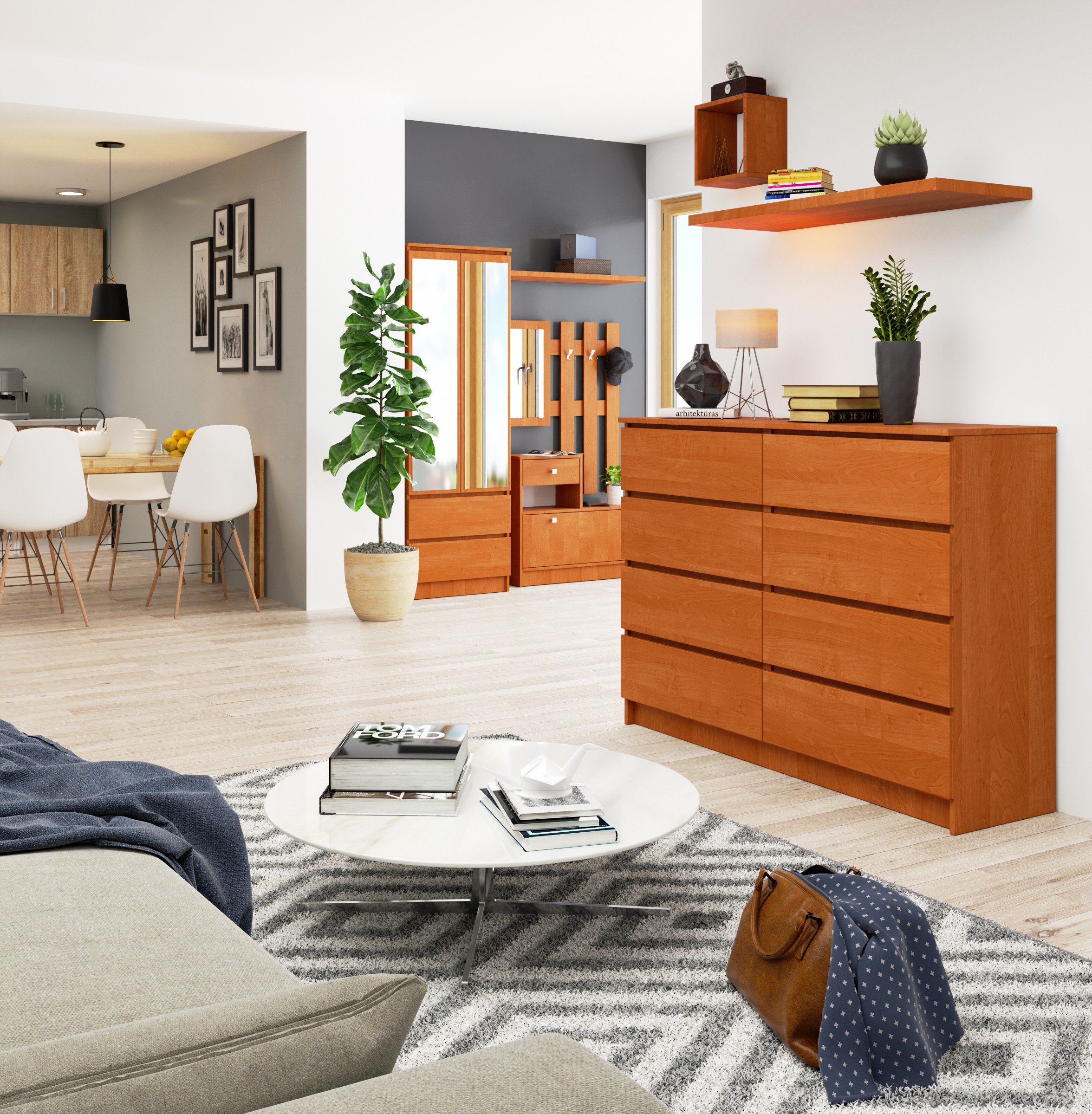 Alksnio spalvos komoda K140 – tai pasiūlymas, skirtas tradiciniu būdu dekoruoto interjero mėgėjams. Universali spalva ir paprastos baldų formos leidžia puikiai atrodyti tokiose patalpose kaip biurai, viešbučių kambariai, bet ir gyvenamųjų patalpų interjeruose – svetainėse, miegamuosiuose, prieškambariuose ir valgomuosiuose. Būdingos pristatomos komodos savybės yra, visų pirma, nesenstantis dizainas, tvirta konstrukcija, praktiškas naudojimas ir lengvas valymas. Gaminys su aštuoniais erdviais stalčiais leis susidėti dokumentus, drabužius, taip pat daugybę kitų reikalingų daiktų tam tikroje patalpoje. Palanki baldų kaina – papildomas jų privalumas. Taip pat raginame susipažinti su kitais šios serijos įrangos elementų pasiūlymais. – Komoda iš dilimui atsparios laminuotos plokštės – Stalčių fasadai pagaminti iš laminuotos plokštės – Stalčiai juda ant metalinių ritinėlių kreiptuvų – Kraštai padengti ABS briauna, kad būtų apsaugota nuo pažeidimų. – Savarankiškai surenkama komoda – Instrukcija pridedama – Garantija 24 mėn.