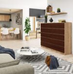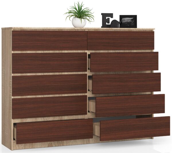 Žmonėms, norintiems rasti didelį ir erdvų baldą, kuriame tilptų kuo daugiau daiktų, pristatyta komoda tikrai patiks. Jame naudojami du madingi, lengvai valomi atspalviai – sonoma ąžuolas ir venge. Tai puikiai tarpusavyje derančios spalvos, kurių dėka visuma dera prie bet kokio interjero. Be vizualinių vertybių, mūsų pasiūlyme esantis įrangos elementas taip pat pasižymi puikia kokybe ir funkcionalumu. Komoda gali būti naudojama svetainėje, miegamajame, darbo kambaryje, jaunimo kambaryje ar bet kuriame kitame interjere, kuriame puikiai tiks 160 centimetrų pločio baldas, susidedantis net iš dešimties erdvių stalčių. Tai idealus produktas tiems, kurie vertina gerą kainos ir kokybės santykį. – Komoda iš dilimui atsparios laminuotos plokštės – Stalčių fasadai Pagaminta iš laminuotos plokštės – Stalčiai juda ant metalinių ritinėlių kreiptuvų – Kraštai padengti ABS briauna, užtikrinančia aukštą apsaugą nuo pažeidimų – Savarankiškas surinkimas komoda – Instrukcija pridedama – Garantija 24 mėn.