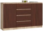 Didelė 160 centimetrų pločio komoda yra tvirtos struktūros gaminys, pagamintas iš geros kokybės laminuotos plokštės. Tai atspari trinčiai medžiaga, todėl komoda puikiai atrodo net ir po ilgo naudojimo. Kaip turėtų atrodyti tobulos komodos? Visų pirma kokybė, bet ir nemokamas naudojimas bei nepriekaištingas dizainas. Tai yra mūsų pasiūlymo ypatybės, kurios puikiai tiks biure ar namuose, nustebindamos lengvu valymu ir funkcionalumu. Už puikią kainą prieinamoje komplektacijoje dera dvi madingos spalvos, kurias noriai renkasi mūsų internetinėje parduotuvėje besilankantys klientai. Garantuojame patvarius ir atsparius baldus už bet kokį biudžetą. – Komoda iš aukštos kokybės 16 mm dilimui atsparios laminuotos plokštės, gamintojas Kronospan – Stalčių fasadai pagaminti iš laminuotos plokštės – Stalčiai juda ant metalinių ritinėlių kreiptuvų – Kraštai padengti ABS briauna, užtikrinančia aukštą apsaugą nuo pažeidimų – Kiekvienos durelės viduje yra po vieną lentyną p> – Savarankiškai surenkama komoda – Instrukcija pridedama – Garantija 24 mėn.