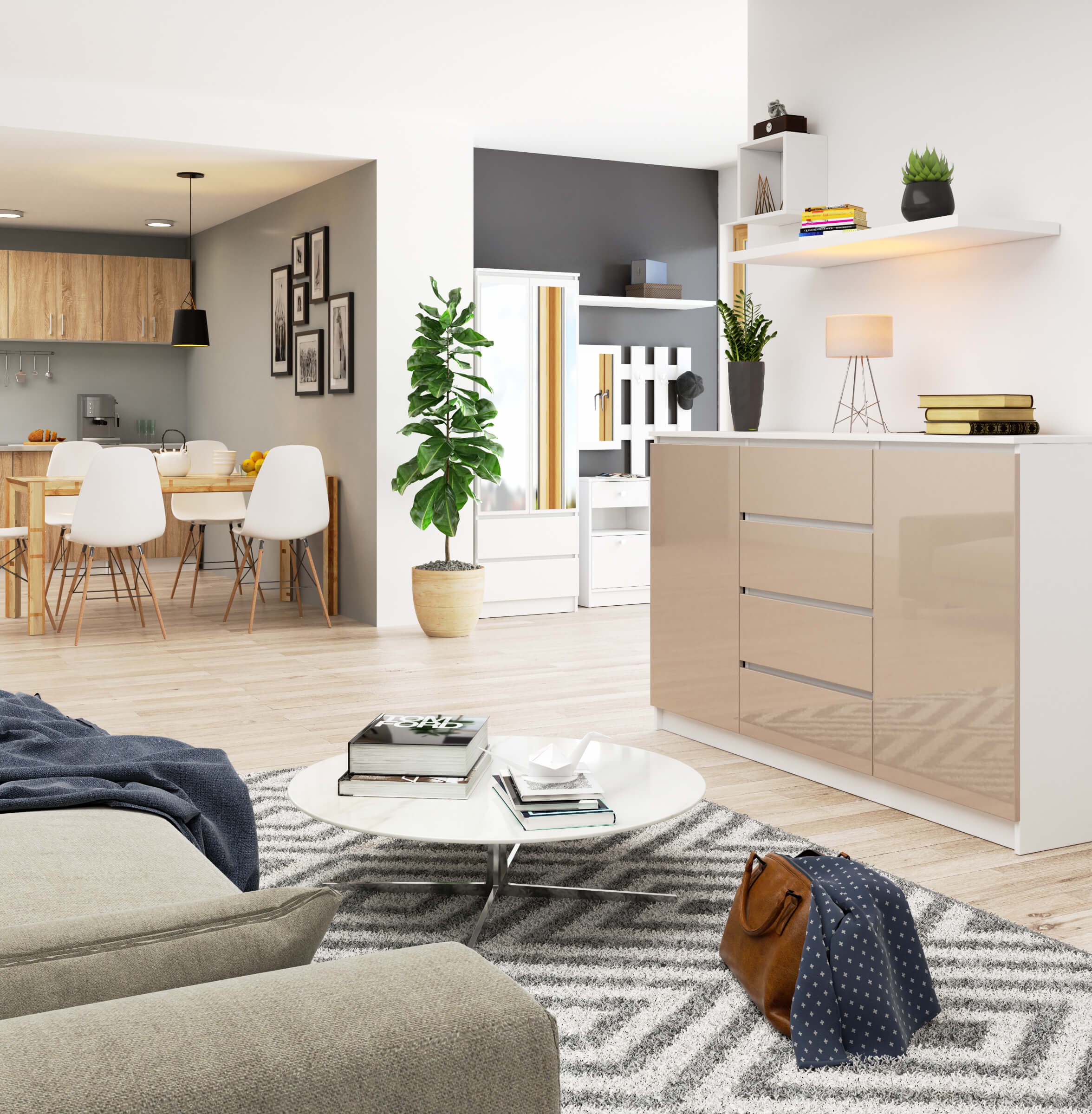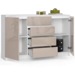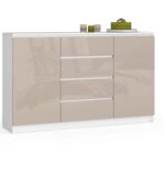 – Komodos korpusas pagamintas iš 16 mm baltos pusiau matinės laminuotos plokštės , atsparus trinčiai – CAPPUCCINO blizgaus dekoro fasadai pagaminti iš AKRYL 19 mm plokštės – Stalčiai yra ant metalinių ritininių kreiptuvų – kraštai padengti ABS briauna, kad būtų apsaugota nuo pažeidimų – Savarankiškai surenkama komoda – Pristatymo vadovas – Garantija 24 mėn.