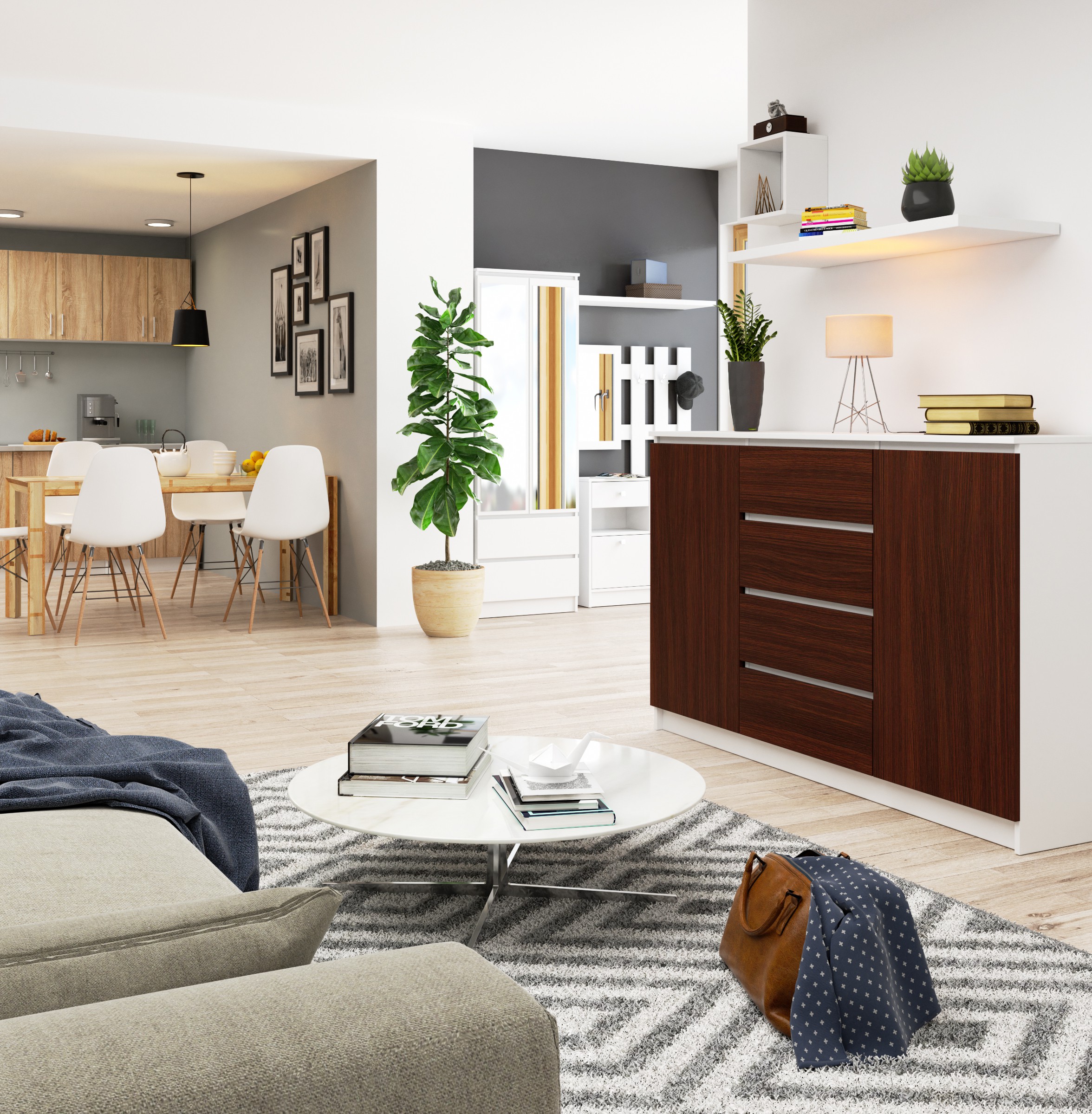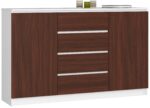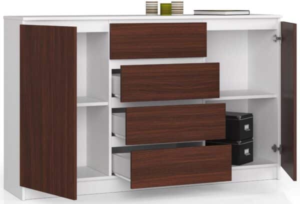 Komoda K 160 cm su 2 durelėmis ir 4 stalčiais bei venge atspalvio fasadais puikiai papildys svetainės ar miegamojo išdėstymą. Erdvios komodos leidžia patogiai susidėti mums reikalingus kasdienius daiktus, kurių dėka namuose išlaikysime tvarkingumą Komodos gali būti naudojamos praktiškai kiekvienuose namuose ar butuose. Pagrindiniai šio tipo komodų privalumai: pagamintas iš aukštos kokybės laminuotos plokštės, atsparios trinčiai ir mechaniniams pažeidimams; komodos krašto apvyniojimas ABS apvadu, kuris papildomai apsaugo ją nuo pažeidimų; patogiai naudojami stalčiai, nes jie yra ant metalinių ritinėlių kreiptuvų; li> elegantiška vieno iš madingiausių wenge atspalvių laminuotų plokščių fasadų išvaizda. Komodos klientui pristatomos formoje skirti montuoti savarankiškai, o aukšta medžiagų kokybė ir kruopštus darbas, atkreipiant dėmesį į smulkiausias detales, leidžia patenkinti net išrankiausius klientus. Komoda K 160 cm su 2 durelėmis ir 4 stalčiais bei fasadais venge atspalvyje gali būti svetainės, valgomojo ar miegamojo įrangos elementas, kuriame galėsite susidėti rankšluosčius, patalynę ar kitų rūšių tekstilės gaminius bei smulkūs daiktai, kuriuos norite laikyti vienoje vietoje. Puikiai tiks tiek klasikiniame, tiek skandinaviškame interjere, nes bus praktiškas, visapusiškai funkcionalus ir elegantiškas išdėstymo elementas. Verta pagalvoti apie jų įsigijimą, jei namuose ar bute trūksta baldų, leidžiančių patogiai laikyti.