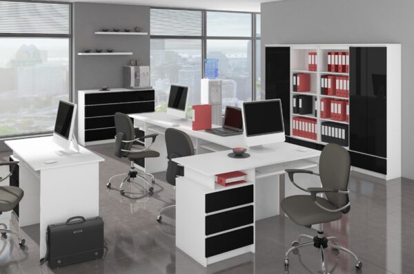 Komoda K 160 cm – tai baldas, pasižymintis išskirtinėmis vizualinėmis savybėmis. Universali juoda blizgių priekinių dalių spalva puikiai dera su pusiau matine kūno apdaila. Monochrominės spalvos puikiai tiks moderniu, minimalistiniu stiliumi dekoruotuose interjeruose, tokiuose kaip svetainė, miegamasis ar jaunimo kambarys. Didelė K 160 cm komoda yra labai patogus baldas, pasižymintis išskirtinėmis savybėmis. praktines vertybes. Savo naudotojams jis siūlo net 4 erdvius stalčius ir dvi gilias lentynas, paslėptas už durų. Tokių dizaino sprendimų dėka yra daug vietos susidėti įvairius aprangos elementus, tokius kaip drabužiai, batai ir kiti, priklausomai nuo poreikių. Didelis privalumas – praktiškas stalviršis, ant į kuriuos galite įdėti dekoratyvines žvakes, knygas ar kitus reikalingus dalykėlius. Komoda išsiskiria nepaprastu spalvų deriniu, todėl ji yra neabejotina bet kurio kambario karalienė. Jo originalus dizainas iškart patraukia akį ir pakelia interjero patrauklumą į dar aukštesnį lygį. – Komodos korpusas pagamintas iš 16 mm baltos pusiau matinės trinčiai atsparios plokštės – Priekinės dalys pagamintos iš 19 mm akrilo plokštės su juodu blizgiu dekoru – Stalčiai juda ant metalinių ritinėlių kreiptuvų – Kraštai padengti ABS briauna, kad būtų gerai apsaugota nuo pažeidimų. – Savarankiškai surenkama komoda – Pristatyme pateikiamos instrukcijos – 24 mėnesių garantija