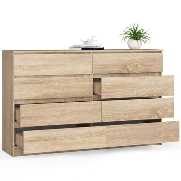 Komoda K 160 cm sonoma ąžuolas išsiskiria šiltomis spalvomis su natūralaus medžio raštu. Dėl to jis puikiai dera prie madingiausių interjero tendencijų, tokių kaip skandinaviškas, klasikinis ar kaimiškas stilius. Natūrali medžio spalva puikiai dera tiek prie šviesių, tiek prie tamsių baldų, tokių kaip sienos, grindys, sofos, pagalvėlės ir kiti dekoratyviniai elementai. Sonoma ąžuolinė komoda skirta visiems, vertinantiems derinį komforto ir funkcionalumo. Tai atsispindi dizaine, susidedančiame iš net 8 plačių ir gilių stalčių. Šis sprendimas labai praktiškas, nes jame galima paslėpti didelius spintos daiktų kiekius ir taip sutaupyti daug vietos spintoje. Svetainė ir miegamasis yra puikios vietos ąžuolinei sonomai moteriškos kelnaitės. Jis puikiai atlieka savo funkcinę funkciją ir tuo pačiu suteikia patalpoms draugišką klimatą. Baldą galima naudoti ir kitose patalpose, nes puikiai tiks visur. – Komodos korpusas pagamintas iš laminuotos plokštės sonoma ąžuolas 16mm atsparus trinčiai – Priekiniai skydai pagaminti iš laminuotos plokštės sonoma ąžuolo – Stalčiai juda ant metalinių ritinėlių kreiptuvų – Kraštai padengti ABS briauna, užtikrinančia aukštą apsaugą nuo pažeidimų – Savarankiškai surenkama komoda – Instrukcija pridedama – Garantija 24 mėn.