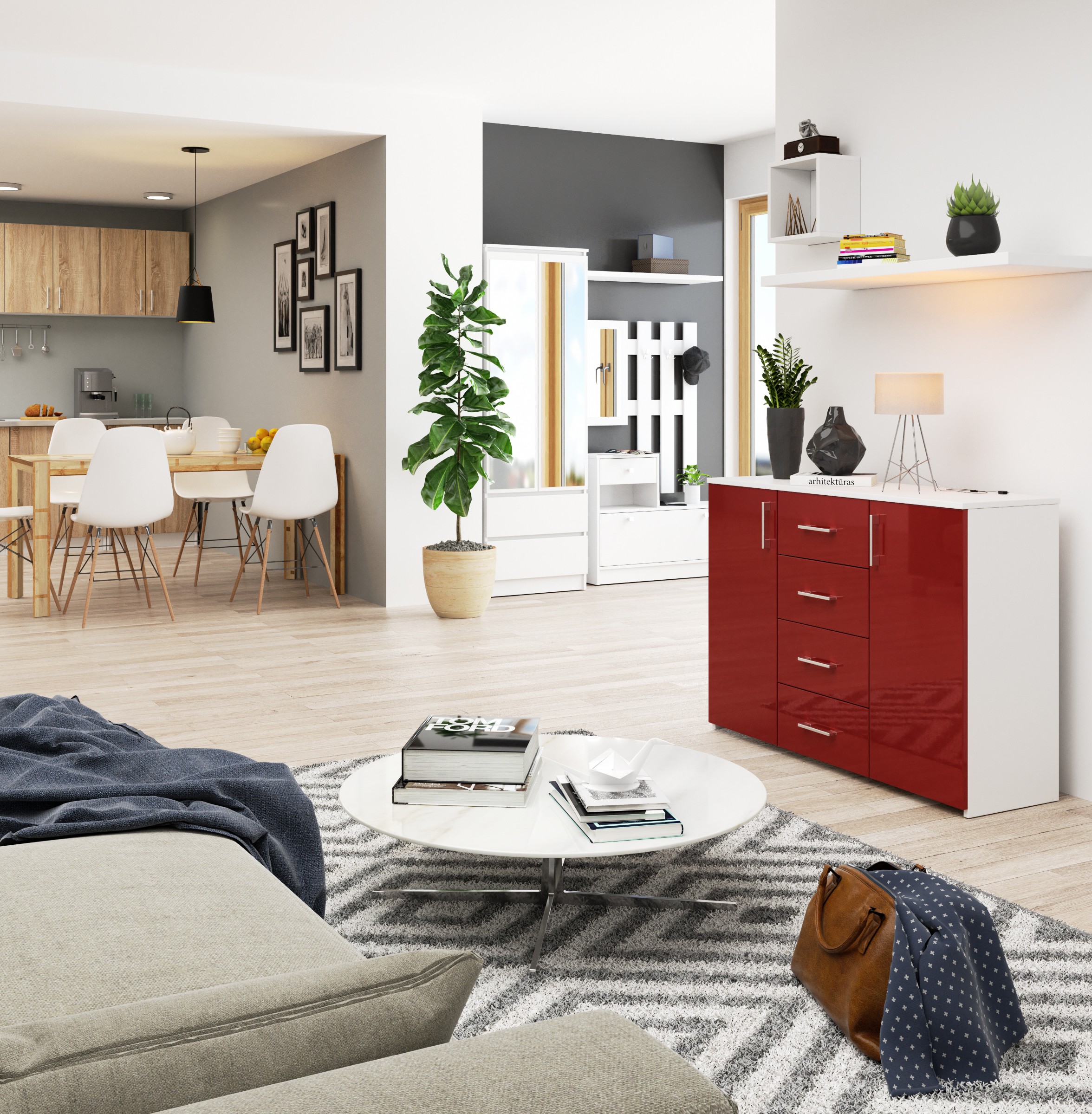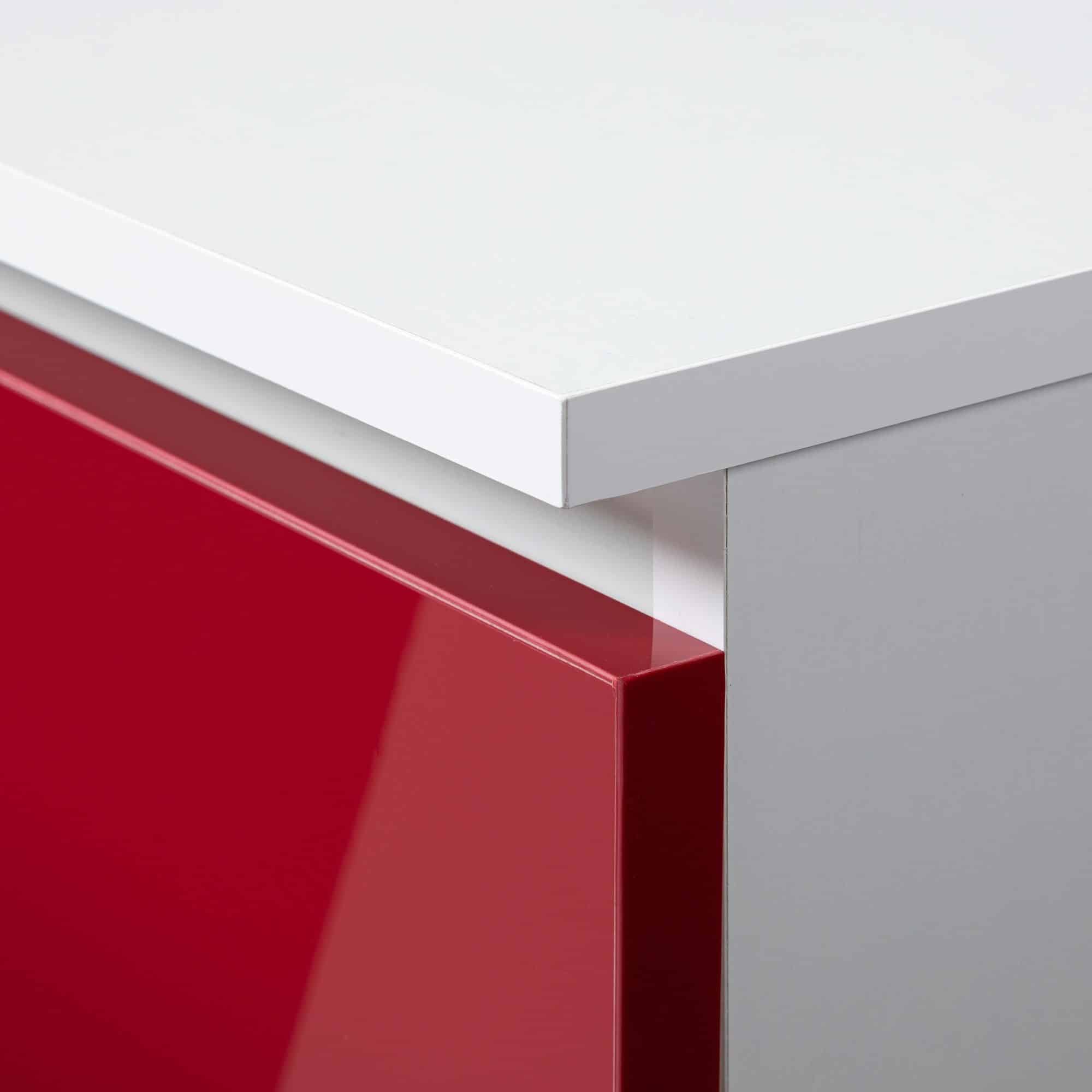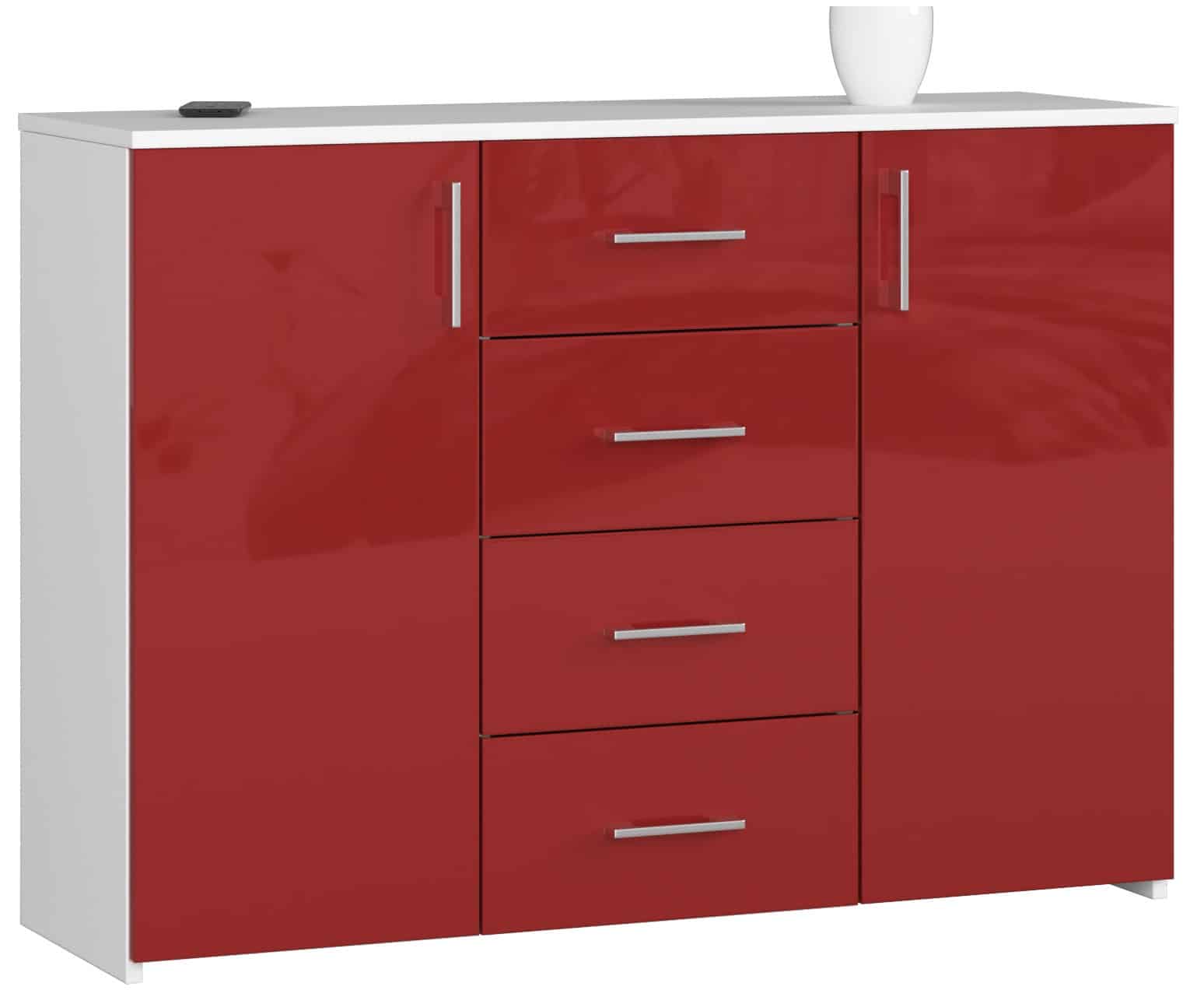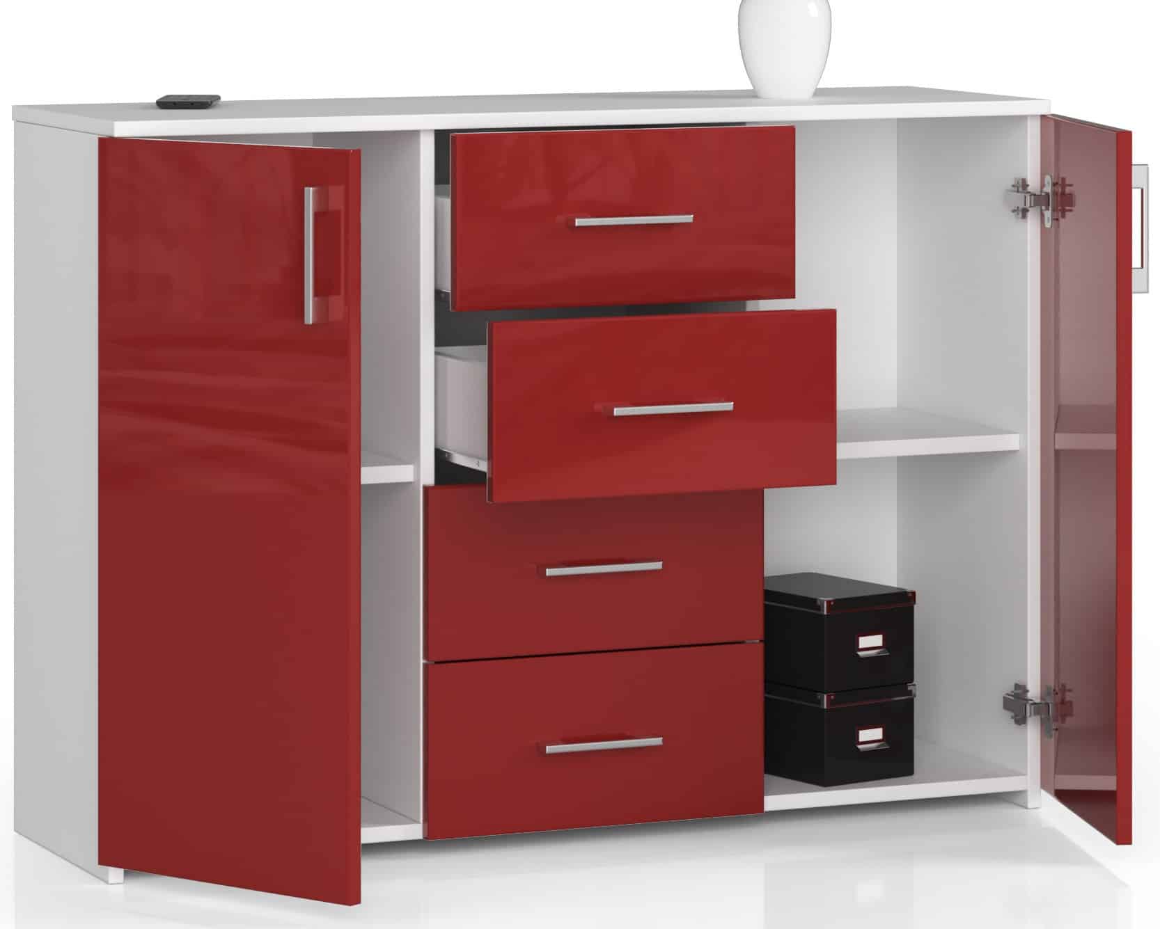 Komoda, modelis K 45, pagaminta gražios, energingos, raudonos spalvos. Blizgios apdailos priekinių dalių raudona puikiai dera su universalia kėbulo balta spalva. Baldai atrodo labai originaliai ir stilingai bei pagyvins net ir pačią vidutiniškiausią erdvę. Baltos/raudonos spalvos blizgus komoda – idealus sprendimas visiems reikliems vartotojams. Jis sukurtas labai funkcionaliai, ką liudija net 4 erdvūs stalčiai ir papildomos lentynos, esančios už durų. Tai puikus dizaino sprendimas, leidžiantis saugoti daug įvairių daiktų. Patogios rankenos, kurios gražiai išsiskiria raudonų fasadų fone – didelis pliusas. Komoda K 45 puikiai tiks modernioje salėje, svetainėje, miegamajame, namų bibliotekoje ir biure. Tai baldas žmonėms, nebijantiems neeilinių sprendimų ir originalių spalvų derinių. Komoda yra baldas ne tik praktiškas, bet ir vizualiai labai patrauklus – Komodos korpusas pagamintas iš laminuotos plokštės balto kilimėlio 16mm atsparus trinčiai – Priekiniai skydai pagaminti iš 19 mm AKRYL plokštės su raudonu dekoro blizgesiu – Stalčiai juda ant metalinių ritinėlių kreiptuvų – Durelių viduje yra viena lentyna – Viršus, šonai ir priekinės dalys padengtos ABS briauna – Sidabrinės rankenos – Savarankiškai surenkama komoda – Instrukcija pridedama – 24 mėnesių garantija