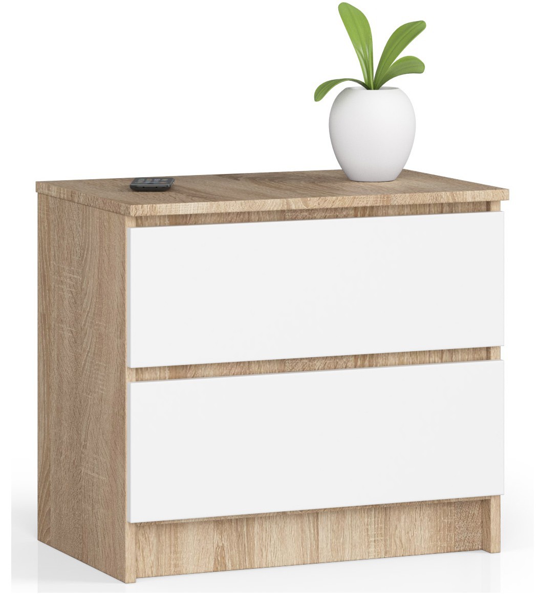 Skoningos sonomos ąžuolo ir klasikinės baltos spalvos derinys yra puikus pasirinkimas kiekvienam, ieškančiam elegantiško ir nesenstančio dizaino. Tokio stiliaus yra ir komoda K60, kuri gali pasitarnauti kaip nedidelė ir tvarkinga saugykla prieškambaryje, svetainėje ar biure, o taip pat kaip solidus ir praktiškas naktinis staliukas miegamajame. Su dviem erdviais stalčiais puikiai atrodys bet kur namuose ar bute! Komoda pagaminta iš 16 mm storio, dilimui atsparios laminuotos plokštės. Baldo kraštai padengti specializuotu ABS ratlankiu, kuris suteikia jiems didesnį atsparumą tipiniams pažeidimams, atsirandantiems dėl įprasto naudojimo. Komodos K60 balti stalčiai eina ant ritinėlių kreiptuvų, pagamintų iš patvaraus metalo. Aukščiau pateikta komoda skirta montuoti savarankiškai – komplekte yra atitinkama instrukcija. Internetinėje baldų parduotuvėje „Akord“ įsigytiems baldams suteikiama 24 mėnesių garantija. – Komoda pagaminta iš dilimui atsparios laminuotos plokštės – Stalčių fasadai iš laminuotos lenta – Stalčiai juda ant metalinių ritinėlių kreiptuvų – Kraštai padengti ABS briauna, užtikrinančia aukštą apsaugą nuo pažeidimų – Savarankiškai surenkama komoda – Pridedamos instrukcijos – Garantija 24 mėn.