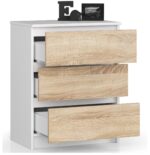 Graži ir praktiška komoda, jungianti dvi nesenstančias spalvas – klasikinės dailios baltos ir madingos sonomos ąžuolo – tai baldas, itin populiarus tarp mūsų internetinėje parduotuvėje besilankančių klientų. Gyvenamojo ar biuro interjero dizaino elementas pagamintas iš 16 milimetrų storio laminuotos plokštės. Jis atsparus trinčiai, o baldų kraštai padengti ABS apvadu. Komodos plotis yra 60 centimetrų, todėl ji lengvai tilps net ir palyginti mažose patalpose. Patogus naudoti kasdien ir neišlaikantis švaros, mūsų parduotuvės pasiūlymas yra aukštos kokybės ir konkurencingos kainos derinys. Baldus galite derinti su kitais įrangos elementais, kuriuos rasite mūsų internetinėje parduotuvėje. – Komoda iš dilimui atsparios laminuotos plokštės – Stalčių fasadai pagaminti iš laminuotos plokštės – Stalčiai juda ant metalinių ritinėlių kreiptuvų – Kraštai padengti ABS apvadu, užtikrinančiu aukštą apsaugą nuo pažeidimų – Savarankiškai surenkama komoda – Komplekte instrukcija – Garantija 24 mėn.