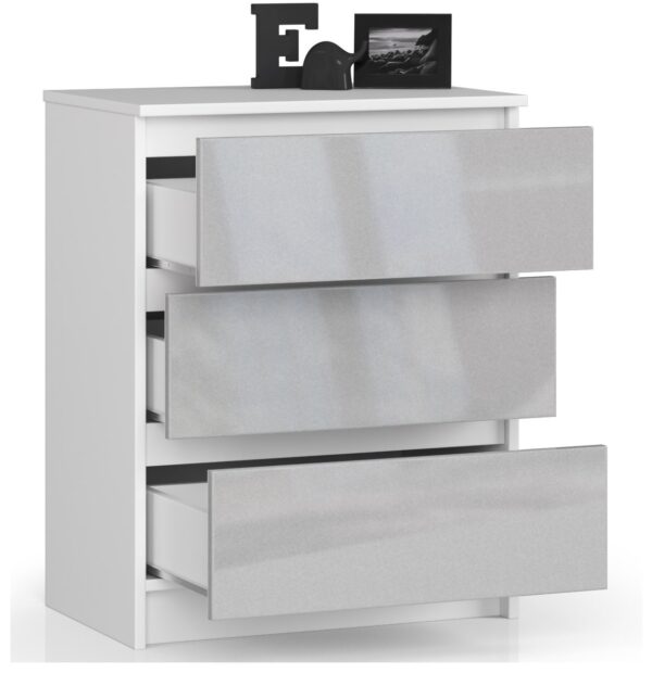 – Komoda iš dilimui atsparios laminuotos plokštės – Priekinės dalys pagamintos iš 19 mm MDF plokštės ACRYLIC METALIC GLOSS – Stalčiai yra ant metalinių ritinėlių kreiptuvų – Kraštai padengti ABS briauna, kad būtų apsaugota nuo pažeidimų – Savarankiškai surenkama komoda – Pristatymo instrukcija – Garantija 24 mėn.