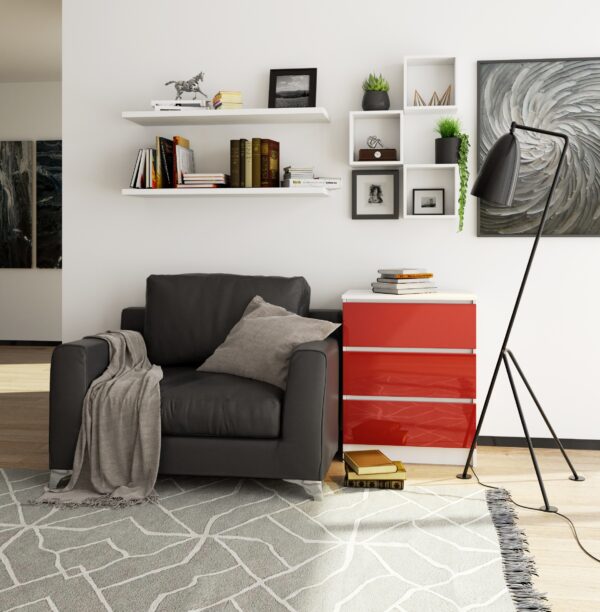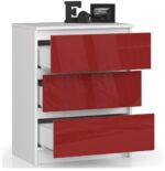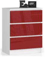 – Komoda iš dilimui atsparios laminuotos plokštės – Priekiniai skydai pagaminti iš 19 mm MDF plokštės AKRILINIO RAUDONO BIZDUMO – Stalčiai yra ant metalinių ritinėlių – Kraštai padengti ABS briauna, kad būtų apsaugota nuo pažeidimų – Savarankiškai surenkama komoda – Pristatymo instrukcija – Garantija 24 mėn.