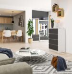 – Komoda iš dilimui atsparios laminuotos plokštės – Stalčių fasadai pagaminti iš laminuotos plokštės – Stalčiai eina ant metalinių ritinėlių – Kraštai padengti ABS briauna, užtikrinančia aukštą apsaugą nuo pažeidimų – Savarankiškai surenkama komoda – Pristatymo vadovas – Garantija 24 mėn.