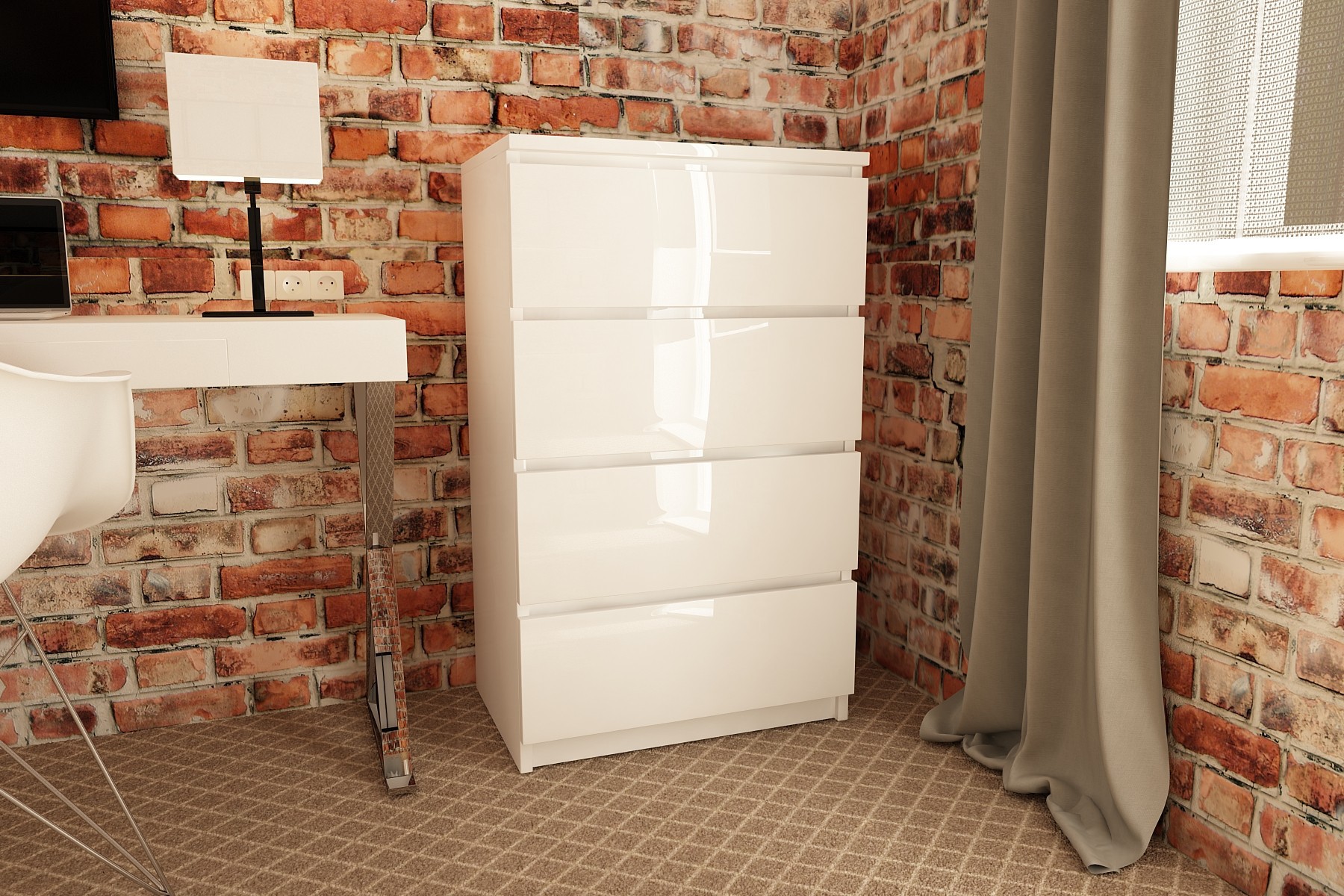 Baltos spalvos komoda K 60 cm yra paprastas, bet elegantiškas baldas, išsiskiriantis nesenstančiu charakteriu. Universalus dizainas leidžia jį naudoti bet kurioje Jūsų pasirinktoje patalpoje – svetainės, jaunimo, vaikų, miegamojo, valgomojo, koridoriaus ar biuro interjere. Spintoje yra keturi erdvūs stalčiai, kurie paprastai atsidaro ir užsidaro. Baltas, blizgus akrilo fasadas yra vertinamas klientų, kurie vertina tiek pasirinktų gaminių vizualines savybes, tiek aukštą kokybę. – Komoda pagaminta iš patvari laminuota lenta, kuri yra atspari dilimui; – Priekinės dalys pagamintos iš MDF ACRYLIC WHITE GLOSS, kurio storis 19 milimetrų; – Naudojami stalčiai juda ant metalinių ritinėlių kreiptuvų ; – priekis, šonai ir viršus padengtas ABS apvadu; – Komoda yra gaminys, skirtas montuoti savarankiškai; – Instrukcija yra komplekte; – Komodos garantija yra dvidešimt keturi mėnesiai;