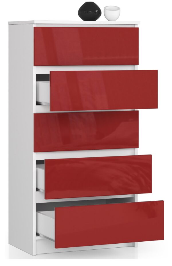 Ar jums patinka neįprasti pasiūlymai ir originalus interjeras? Ieškote nepastebimo baldo, kuris pavogs jūsų širdį ir leistų sukurti svajonių kambarį? Pristatoma K60 komoda su penkiais erdviais stalčiais tikrai pateisins Jūsų lūkesčius. Tai baldas, kuriame dera patrauklus dizainas, funkcionalumas ir puiki kokybė. Įdomiai suprojektuoti baldai patiks pirmiausia jaunam žmogui, nebijančiam intensyvių spalvų ir turinčiam įdomių minčių derinimui. Komodai ir kitiems šios serijos pasiūlymams garantuojame patrauklią kainą. – Komoda iš dilimui atsparios laminuotos plokštės – Priekinės dalys pagamintas iš 19 mm MDF akrilo, raudono blizgesio – Stalčiai yra ant metalinių ritinėlių kreiptuvų – Stalviršis, šonai ir fasadai yra faneruoti ABS apvadu – Savarankiškai surinkimo komoda – Instrukcija pridedama – Garantija 24 mėn.
