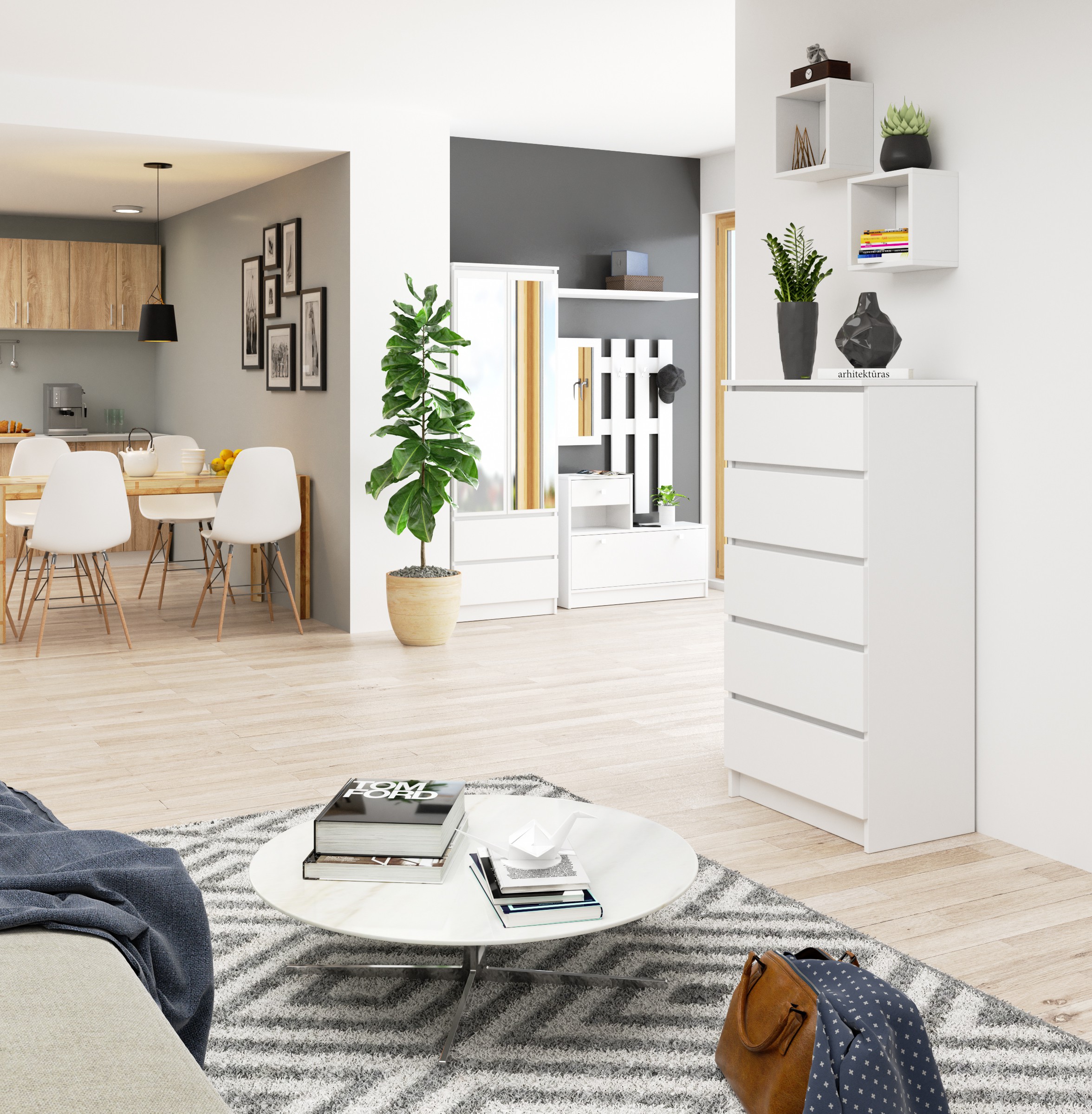 Nemirtinga balta – tai spalva, kurią vis dar vertina tiek tradiciškai dekoruoto interjero, tiek šiuolaikiškai įrengtų erdvių mėgėjai. Aukšta balta komoda K60 yra baldas su penkiais stalčiais – idealus pasiūlymas prieškambaryje, valgomajame, miegamajame ar svetainėje. Baldai taip pat gali būti sėkmingai naudojami biuruose, biuruose ar kitose patalpose, kur reikia laikyti daug daiktų. Klientai šį pasiūlymą vertina dėl palankaus kainos ir kokybės santykio. Kruopštus ilgaamžių medžiagų apdirbimas nėra vienintelis pristatomo gaminio privalumas. Jį lengva valyti, patogu naudoti ir, be to, labai efektyvu, todėl jį noriai renkasi mūsų internetinėje parduotuvėje besilankantys klientai. – Komoda pagamintas iš Kronospan aukštos kokybės laminuotos plokštės, atsparios dilimui – Stalčių fasadai pagaminti iš laminuotos plokštės – Stalčiai eina ant metalinių ritinėlių kreiptuvų – Kraštai uždengti su ABS apvadu, užtikrinančiu aukštą apsaugą nuo pažeidimų – Savarankiškai surenkama komoda – Komplekte instrukcija – Garantija 24 mėn.