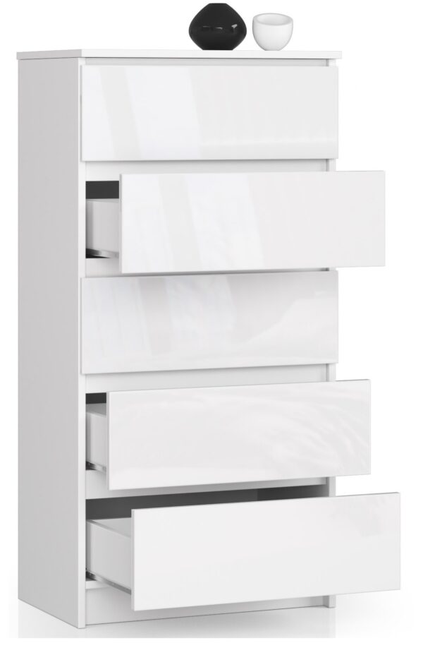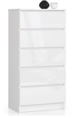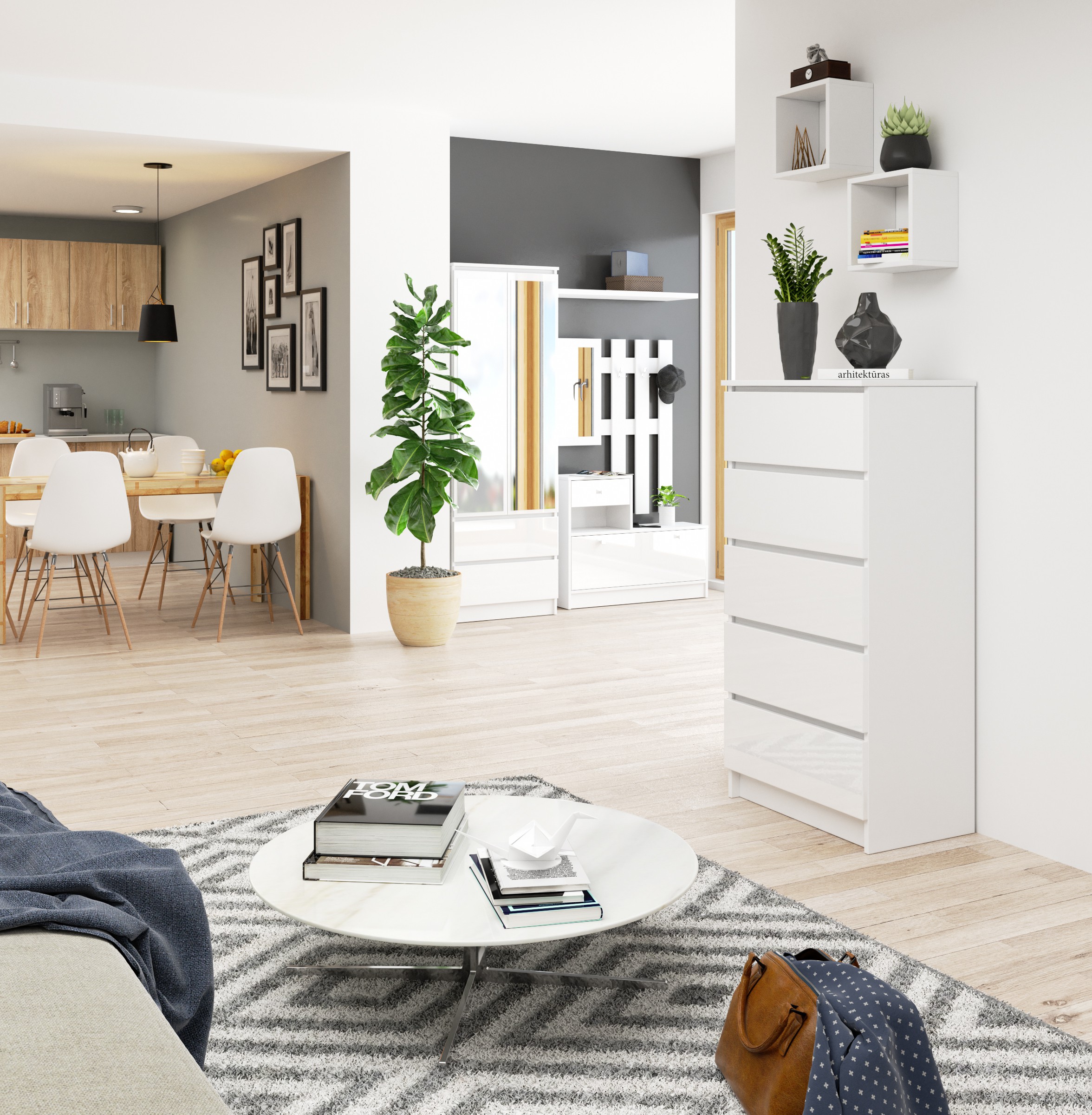 Erdvi komoda su keturiais stalčiais yra baldas, kuris bus naudojamas daugelyje gyvenamųjų ir biuro patalpų. Tai leis jums organizuoti vietą reikalingų daiktų laikymui miegamajame, svetainėje, vaikų ar jaunimo kambaryje. Taip pat puikiai tiks namų biure ar koridoriuje. Jame dera paprastas ir elegantiškas dizainas, nesenstančios spalvos ir tvirta struktūra. Balta komoda K 60 cm yra su blizgiais akrilo fasadais. – skrynios pagamintos iš laminuotos plokštės, atsparios dilimui ir pasižyminčios dideliu patvarumu; – Fasadams sukurti naudotos ACRYL WHITE GLOSS MDF plokštės, kurių storis 19 milimetrų; – Komodos stalčiai juda ant metalinių ritinėlių kreiptuvų; – Priekinės dalys, šonai ir viršus padengtas apvadu ABS; – Pateiktas gaminys skirtas montuoti savarankiškai; – Instrukcija yra komplekte; p> – Komodos garantija yra dvidešimt keturi mėnesiai.