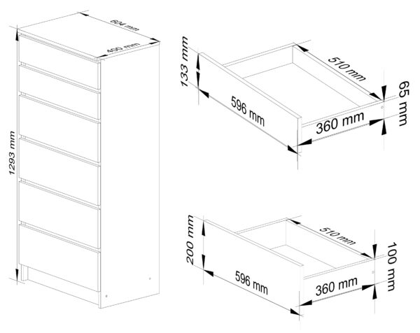 – Komoda iš dilimui atsparios laminuotos plokštės – Stalčių fasadai pagaminti iš laminuotos plokštės – Stalčiai yra ant metalinių ritinėlių kreipiančiųjų – Kraštai padengti ABS briauna, užtikrinančia aukštą apsaugą nuo pažeidimų – Savarankiškai surenkama komoda – Pristatymo vadovas – Garantija 24 mėn.