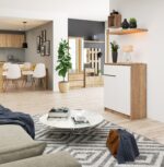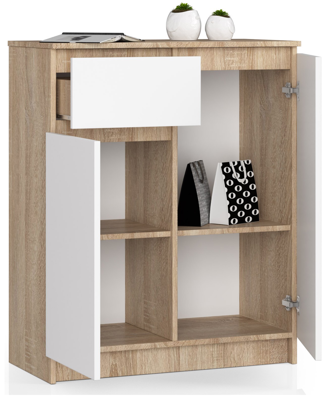 Maža komoda yra įrangos elementas, kuris bus naudojamas bet kurioje patalpoje. Ryškios spalvos, solidi konstrukcija ir kruopštus darbas leido sukurti spintą, kuri tiks, pavyzdžiui, prieškambaryje, svetainėje ar jaunimo kambaryje, taip pat miegamajame. Jis taip pat gali būti naudojamas biuro patalpoje, kur bus galima laikyti daugybę dokumentų ir kitų biuro reikmenų. Komoda susideda iš dviejų uždarų spintelių (kiekvienoje su dviem lentynomis) ir stalčių. Balduose dera madingos spalvos – balta ir sonoma ąžuolas. Komoda – tai baldas iš kokybiškos laminuotos plokštės su 16 milimetrų storio; kaitlentė Kronospan yra labai atspari trinčiai; Spintelių ir stalčių fasadai pagaminti iš patvarios laminuotos plokštės; stalčius juda ant metalinių ritinėlių kreiptuvų; Kraštai padengti ABS apvadu. Ji užtikrina aukštą apsaugą pažeidimo atveju; Komoda skirta montuoti savarankiškai, o instrukcijos yra pakuotėje; Gaminio garantija yra dvidešimt keturi mėnesiai . Komoda K 80 cm. gali būti laisvai derinamas su kitais baldais, pavyzdžiui, mažesnėmis ir didesnėmis spintomis, rašomaisiais stalais ar lentynomis, taip pat įtraukta į pasiūlymą. Tai geros kokybės, praktiški baldai už prieinamą kainą. Jų dėka bus galima sukurti šviesią, malonią akiai erdvę su paprastais, bet elegantiškais baldais, kurie puikiai dera prie bet kokio modernaus interjero.