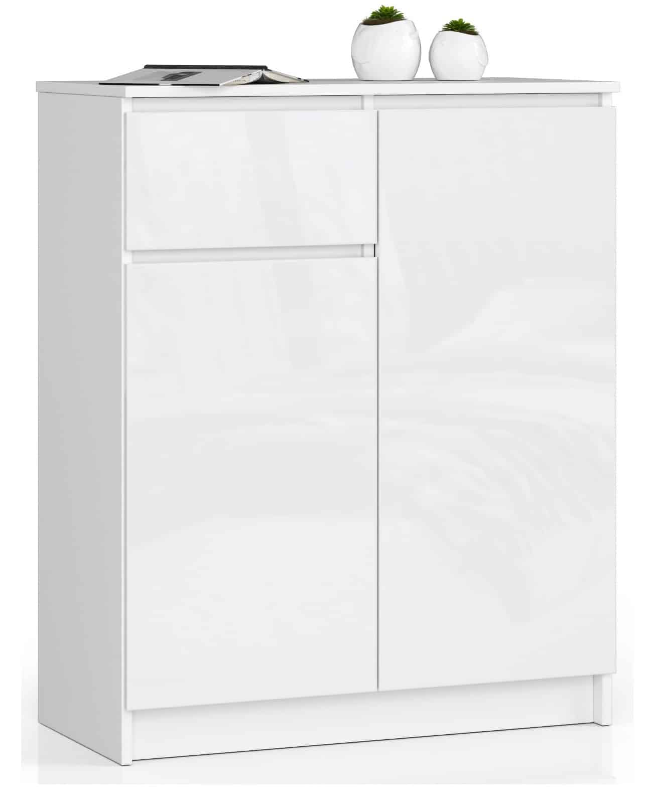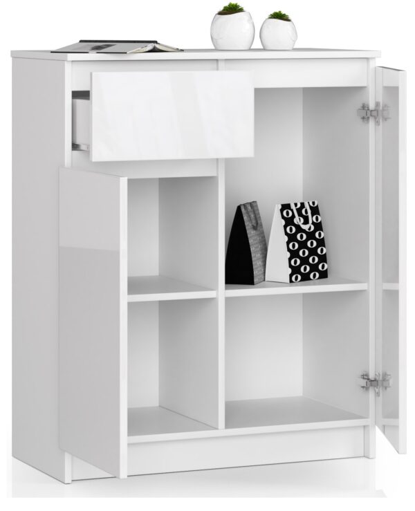 Mažoje baltoje komodoje įrengtas praktiškas stalčius ir dvi uždaros spintelės – kiekvienoje jų yra po dvi lentynas. Baldai pasižymi tvirta konstrukcija ir kruopščiu apdirbimu. Pateiktas pasiūlymas džiugina akį ir pateisina net išrankiausių klientų lūkesčius funkcionalumu. K komoda 80 cm. yra balto korpuso su blizgiais tos pačios spalvos priekiais derinys. Skoningas baldas neabejotinai puikiai atrodys daugelyje skandinavišku, minimalistiniu ar moderniu stiliumi dekoruotų interjerų Baldas buvo pagamintas iš aukšto -kokybiška 16 milimetrų storio laminuota lenta; Kaitlentė Kronospan pasižymi dideliu atsparumu dilimui; Stalčių fasadai taip pat pagaminti iš laminuotos plokštės; Stalčius juda ant metalinių bėgių ritinėlių; ABS apvadu padengti kraštai yra atsparūs pažeidimams; Komoda skirta montuoti savarankiškai; Instrukcijos yra komplekte; Gaminio garantija yra 24 mėnesiai. Jei ieškote baldo, kuriame derinama aukšta kokybė, prieinama kaina ir nesenstantis dizainas, tai tikrai jums tinkamas pasiūlymas. Spintelė gali būti naudojama tiek biure, tiek gyvenamajame kambaryje – hole, svetainėje, jaunimo kambaryje, vaikų kambaryje, valgomajame, namų biure ar miegamajame. Derinant su kitais tos pačios kolekcijos elementais, suteikiamos praktiškai neribotos galimybės.