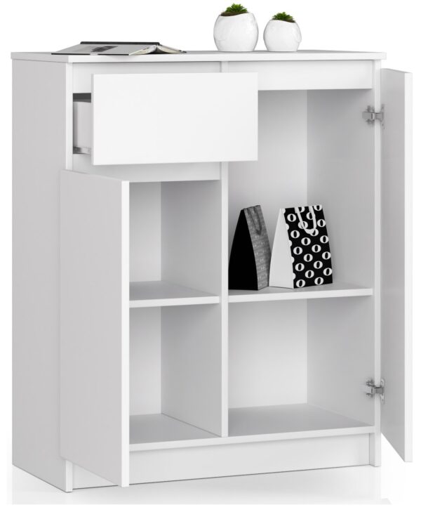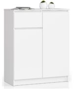 – Komoda iš aukštos kokybės 16 mm dilimui atsparios laminuotos plokštės, gamintojas Kronospan – Stalčių fasadai iš laminuotos plokštės – Stalčius eina ant metalinių ritinėlių – Kraštai padengti ABS briauna, kad būtų gerai apsaugota nuo pažeidimų – Kiekvienos durelės viduje yra viena lentyna – Savarankiškai surenkama komoda – Pateikiama instrukcija – Garantija 24 mėn. Šiuolaikinė balta komoda su stalčiumi ir erdviomis lentynomis – tai pasiūlymas žmonėms, kurie mėgsta paprastą , bet kartu efektingas skandinaviškas stilius. Tai kokybiškas baldas, kurį dėl savo vizualinių savybių noriai renkasi mūsų klientai. Balta komoda pasižymi madinga ir universalia spalvų gama. Atkreiptinas dėmesys ir į kruopštų apdirbimą bei tvirtą konstrukciją, kurios garantuoja pristatomų baldų ilgaamžiškumą. 80 cm komoda gali būti naudojama bet kurioje patalpoje – viešbutyje, biure ar gyvenamajame kambaryje. Puikiai atrodys, pavyzdžiui, miegamajame, svetainėje, valgomajame ar jaunimo kambaryje. Siūlome patrauklią kainą už prekę, kuri tikrai patiks ir padės sukurti nepakartojamą atmosferą bet kuriame madingai dekoruotame interjere. Baldai pagaminti iš laminuotos plokštės (storis 16 milimetrų), kuri rodo labai gerą atsparumą dilimui. Kraštai padengti ABS apvadu.