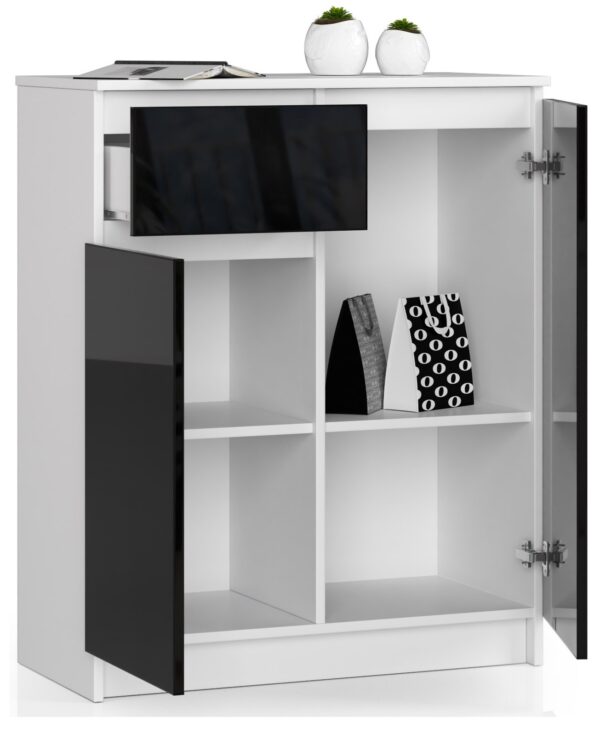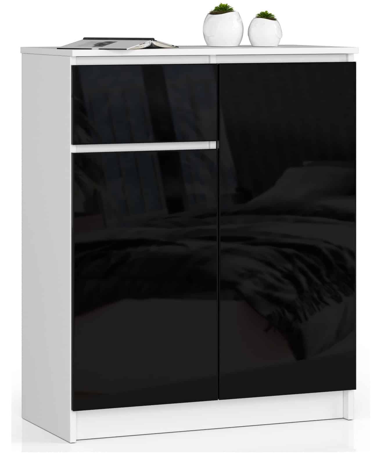 Komodos – tai baldai, kurie gali turėti skirtingą stilių ir charakterį. Tačiau daugelis žmonių ieško modernaus baldo. Tokiu atveju verta atkreipti dėmesį į mūsų siūlomą K 80 cm komodą. Paprastos formos, baltas korpusas, juodi stalčių fasadai suteikia įdomų vizualinį efektą. Baldai puikiai tiks svetainei, miegamajam ar svetainei. Pasižymi patvarumu ir funkcionalumu. Komoda K 80 cm – unikalus baldas, turintis daug privalumų: ilgaamžiškumas – baldai pagaminti iš aukštos kokybės 16 mm laminuotos plokštės, atsparios trinčiai ir įbrėžimams, naudojimo patogumas – stalčius juda ant metalinių ritinėlių kreiptuvų, atsparumas – baldų kraštai padengti ABS apvadu, kuris užtikrina aukštą apsaugą nuo pažeidimų, talpa – komodoje daug erdvės vystymuisi: stalčius ir lentynos (dvejos durys), funkcionalumas – baldas padeda palaikyti tvarką ir paslėpti įvairius daiktus viduje , kita vertus, dekoracijas galima dėti ant stalviršio, moderni išvaizda – baldas puikiai dera į naujausias tendencijas ir patraukia akį, patraukli kaina, garantija 24 mėn. Komoda K 80 cm yra paprastas baldas savo forma ir naudingas. Tuo pačiu metu jos juodos ir baltos spalvos intriguoja, suteikia stiliaus ir originalumo. Puikiai tiks minimalistiniame ir moderniame interjere. Baldai tvirtai pagaminti iš kokybiškų medžiagų. Jis tikrai tarnaus daugelį metų. Jis skirtas savarankiškam surinkimui, kurį palengvina prie užsakymo pateiktos instrukcijos.