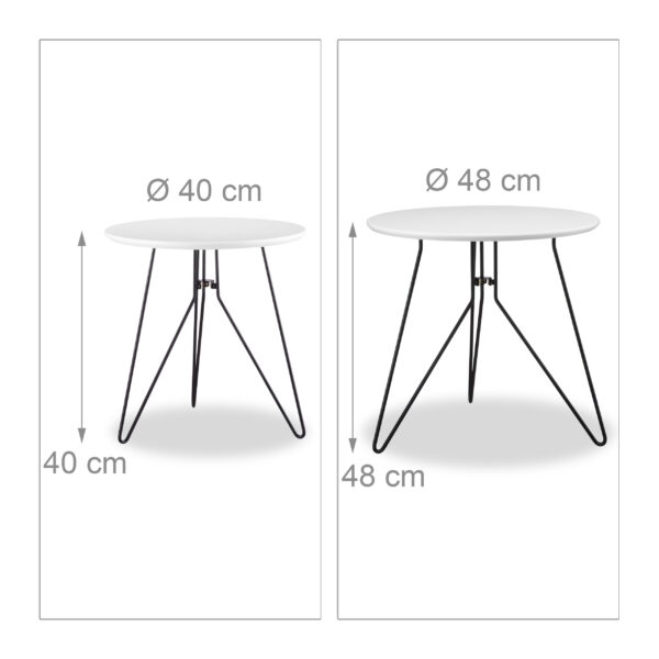 Kiekvienas staliukas turi tris metalines kojeles, kurios užtikrina stabilumą ir saugumą. Skirtingi staliukų dydžiai leidžia juos lengvai pritaikyti įvairiose erdvėse, o minimalistinis trikojis dizainas suteikia modernumo ir elegancijos.
