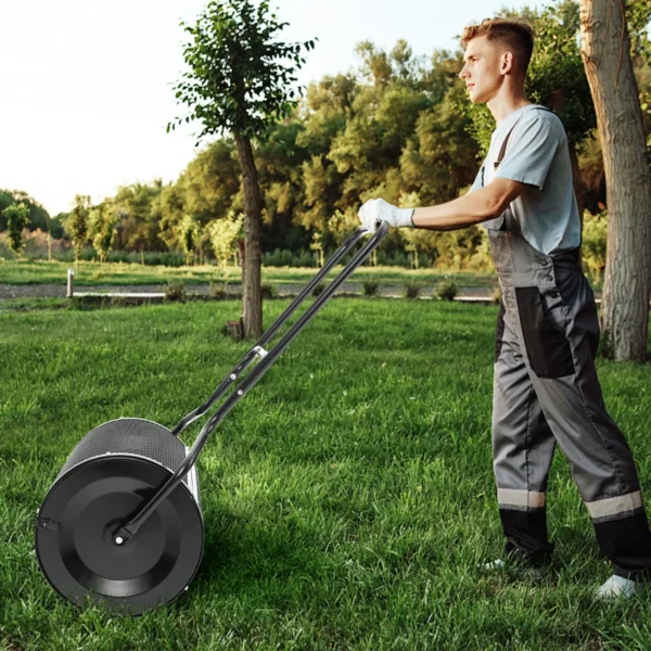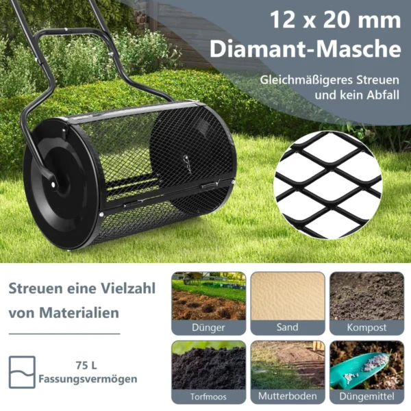 - Didelė 75 litrų talpa skirtas kompostui, durpių samanoms, smėliui ir viršutinio dirvožemio sluoksniui.
