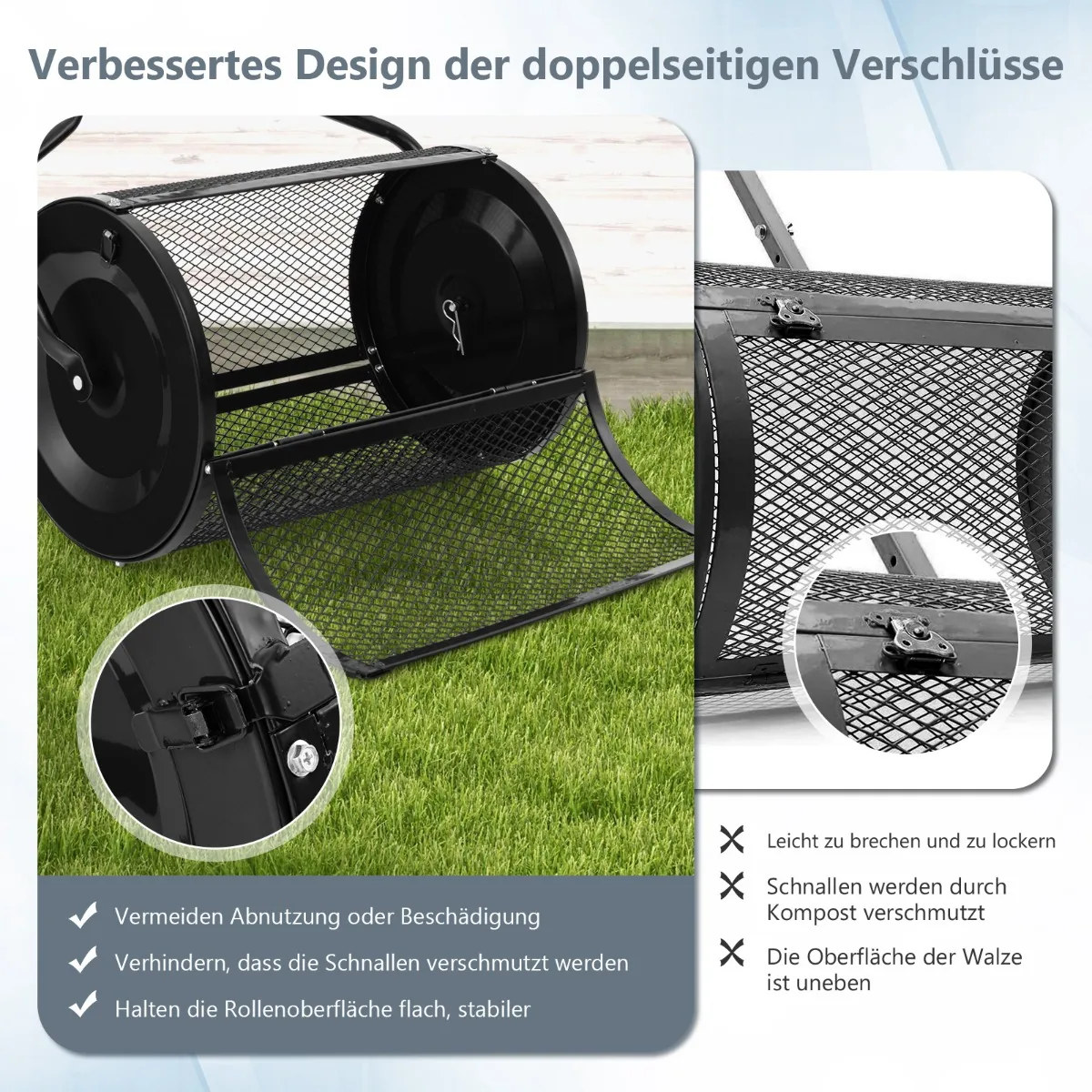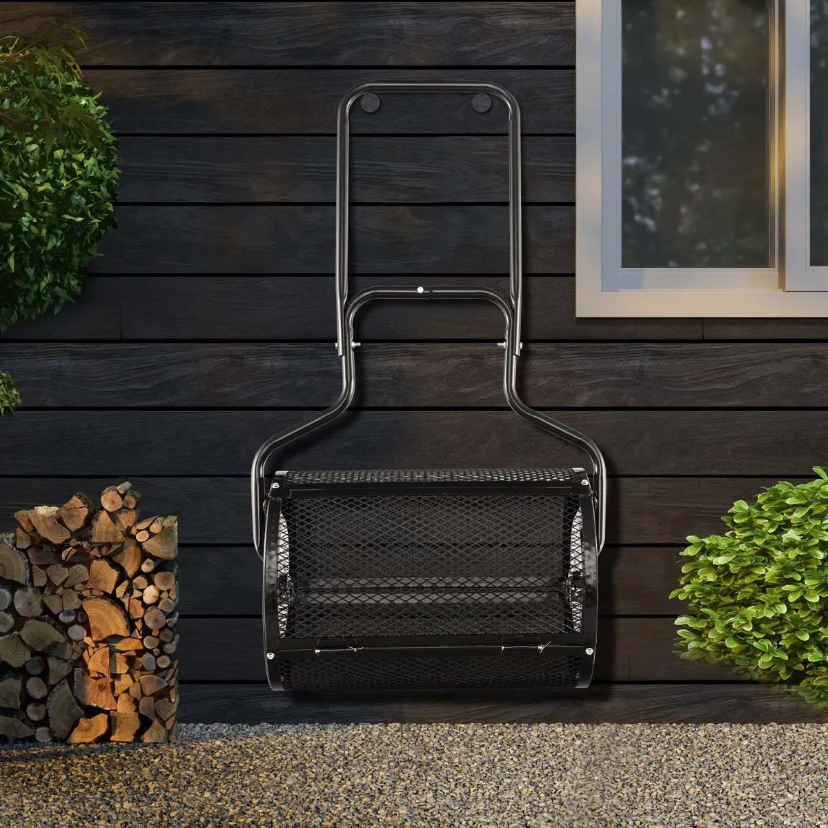 - Komposto barstytuvas su milteliniu būdu dengtu metaliniu korpusu ir tvirtu metaliniu tinkleliu.