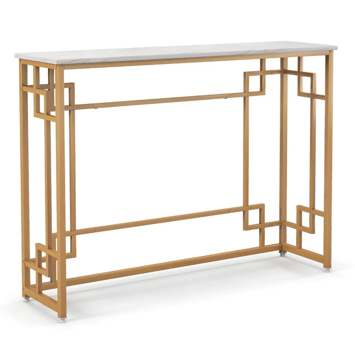 Konsolė 110x30x81 cm baltos ir auksinės spalvos puikiai tinka įvairioms patalpoms, suteikdama erdvei funkcionalumo ir estetikos. Baltos dirbtinio marmuro imitacijos stalviršis kartu su aukso spalvos metalo rėmu sudaro patvarų ir saugų baldą, tinkantį prieškambariui, koridoriui ar svetainei.