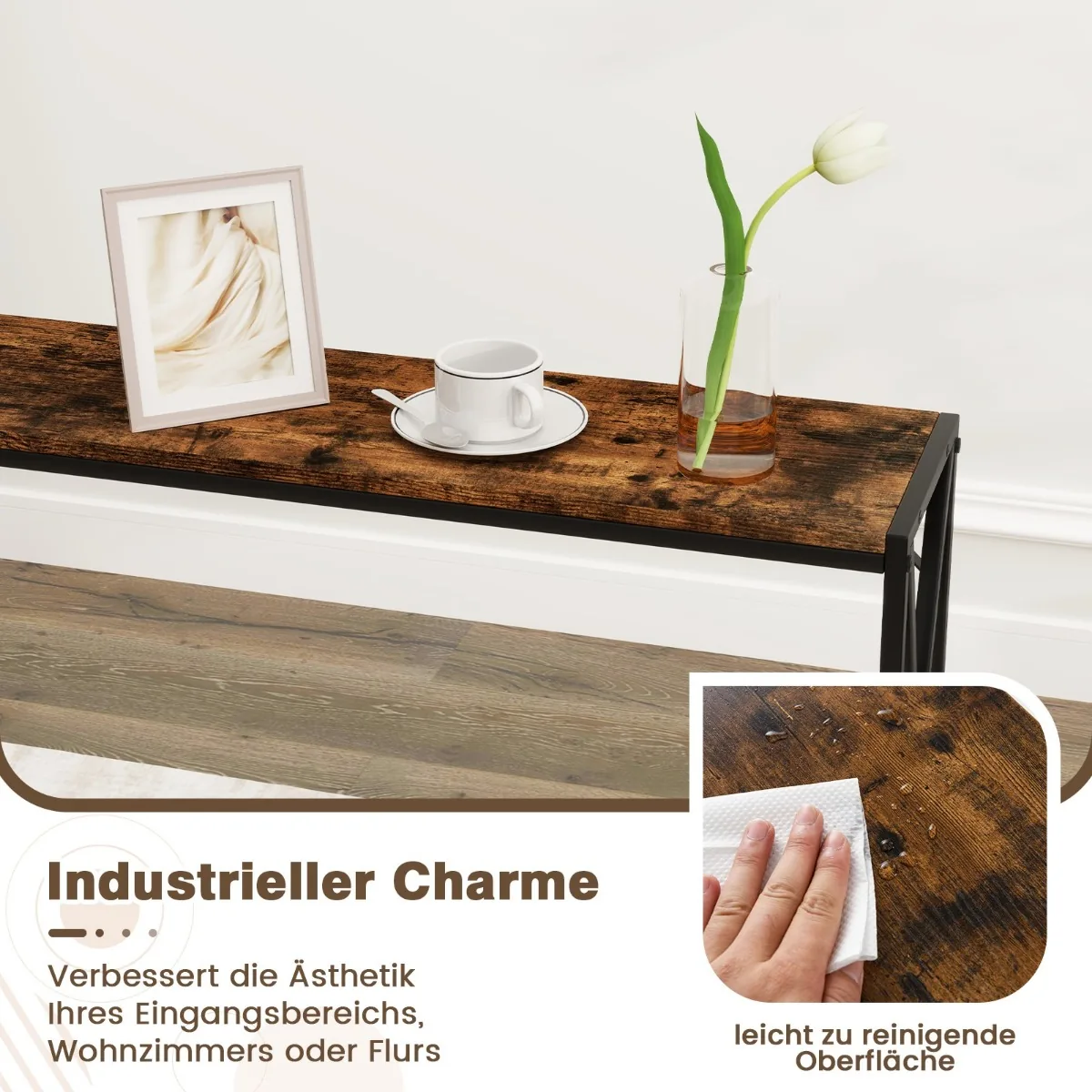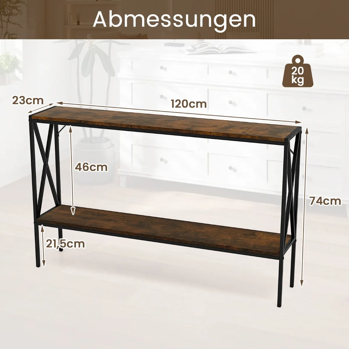 • Tvirtas 120 x 23 x 74 cm (I x P x A) matmenų konsolinis stalas, skirtas mažoms ir vidutinėms erdvėms.