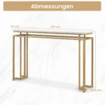 Konsolė 120x30x80,5cm baltos ir auksinės spalvos puikiai tiks prieškambariui ar kitai kompaktiškai erdvei. Šis konsolinis stalas turi dirbtinio marmuro stalviršį ir metalinį rėmą, kuris suteikia stabilumo bei ilgaamžiškumo. Tinka daiktų laikymui bei dekoracijų eksponavimui.