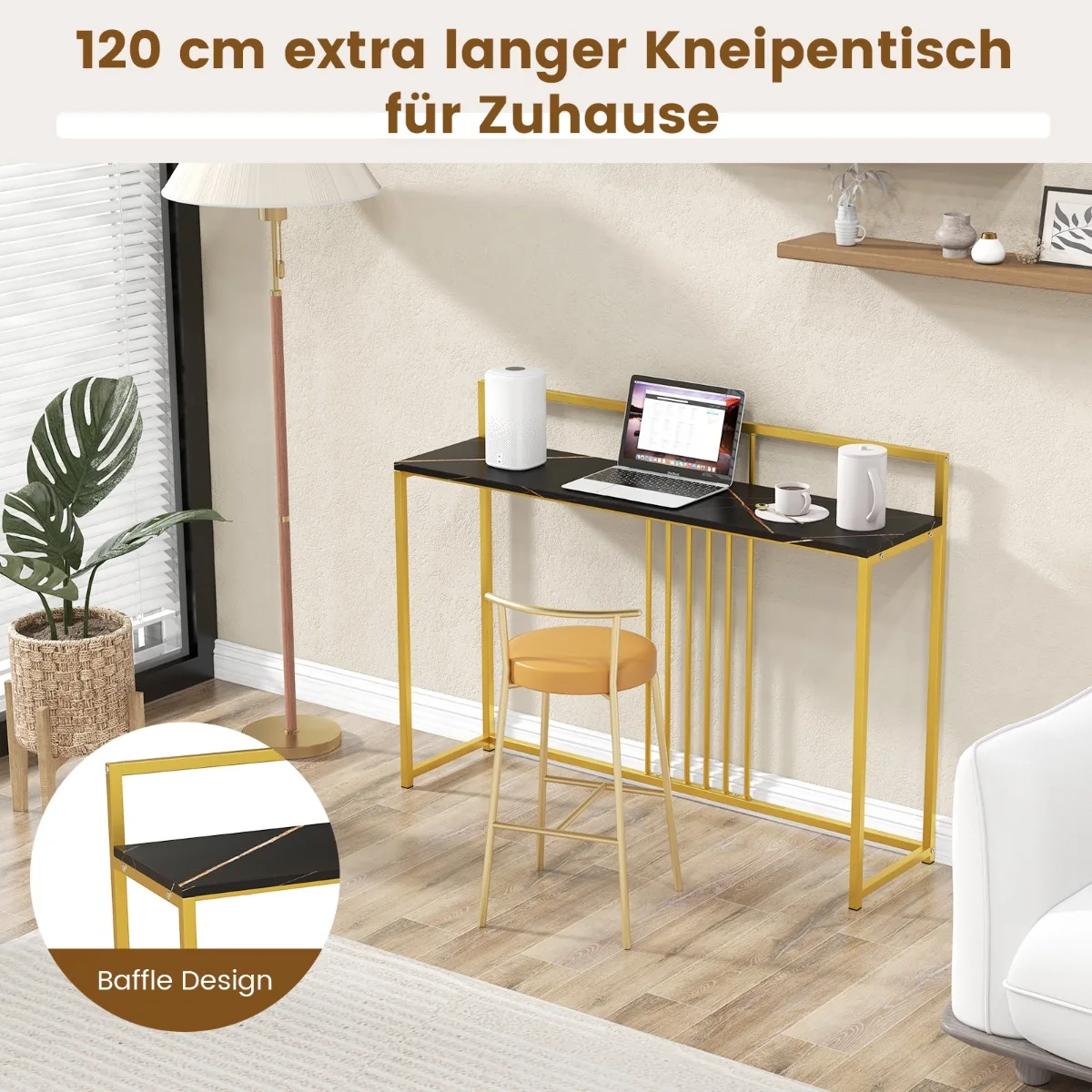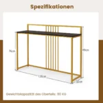 Konsolė 120x32x89 cm juodos ir auksinės spalvos puikiai tinka koridoriui, prieškambariui ar svetainės erdvei papildyti. Šis konsolinis stalas pasižymi tvirtu metaliniu rėmu bei dirbtinio marmuro stalviršiu, kurie leidžia užtikrinti ilgaamžiškumą ir patogumą naudojant kasdien.