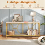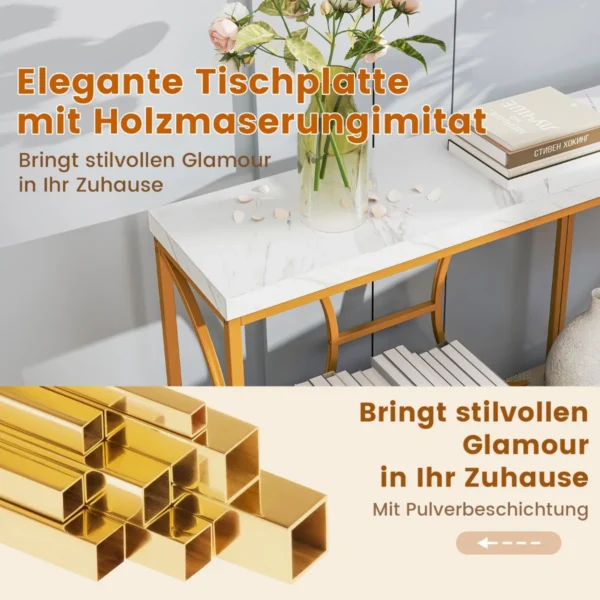 Konsolė 180x30x80cm, auksinės ir baltos spalvos, puikiai tinka jūsų namų erdvei pagerinti. Šis konsolinis staliukas išsiskiria metaliniu rėmu ir dirbtinio marmuro stalviršiu, derančiu su įvairiais interjero stiliais. Dviejų pakopų dizainas suteikia pakankamai vietos įvairiems daiktams laikyti.