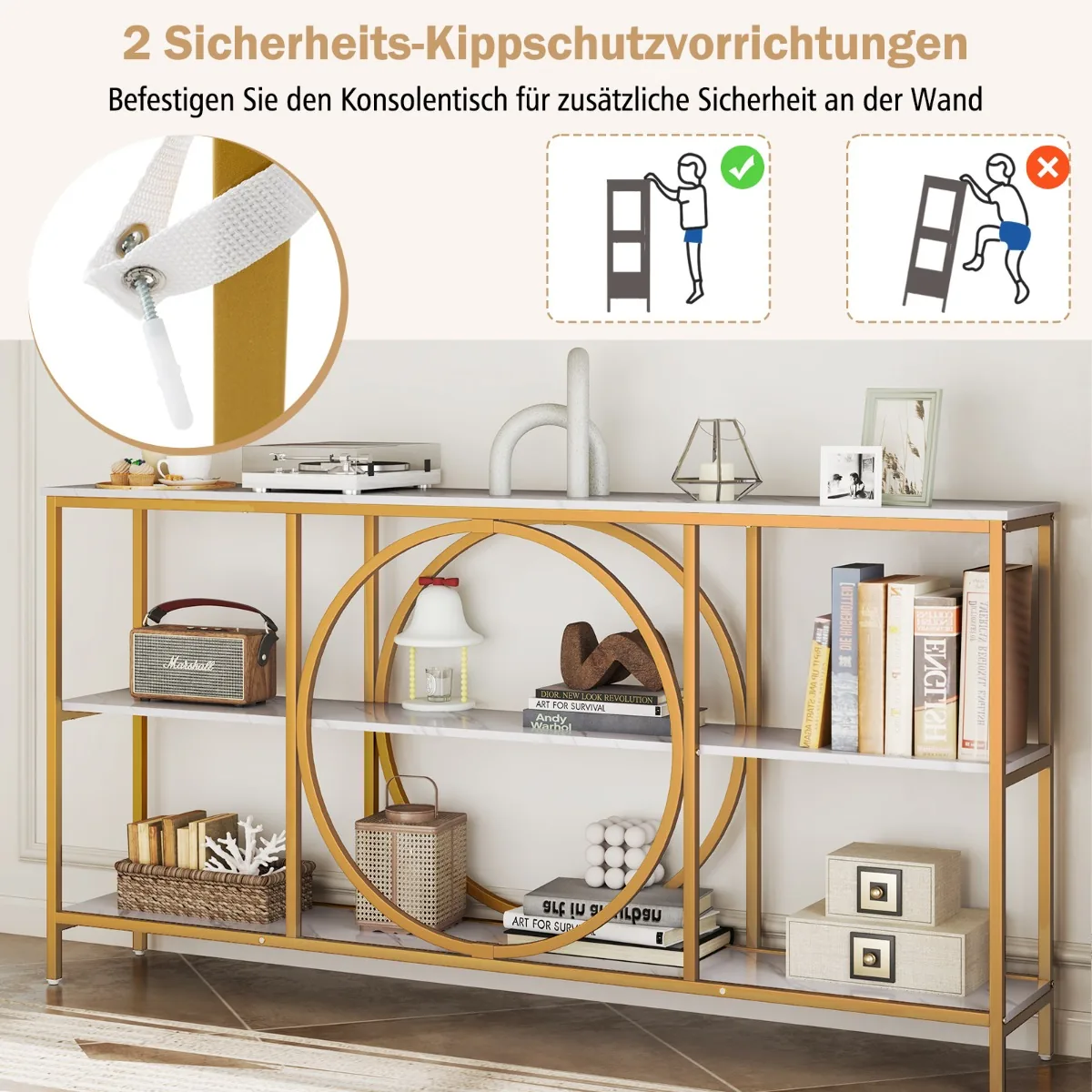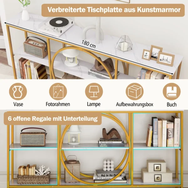 Konsolė 180x30x90cm auksinės ir baltos spalvos puikiai tinka svetainėms, prieškambariams ar koridoriams. Šis konsolinis stalas pasižymi patvariu metaliniu rėmu ir funkcionalia trijų pakopų saugojimo sistema, užtikrinančia patogų daiktų tvarkymą bei papildomą stabilumą.