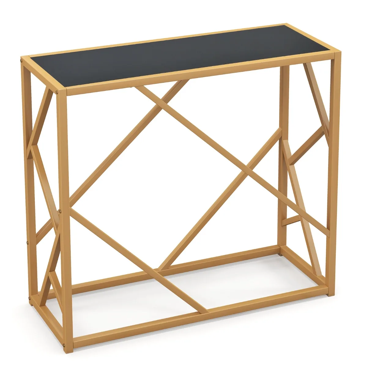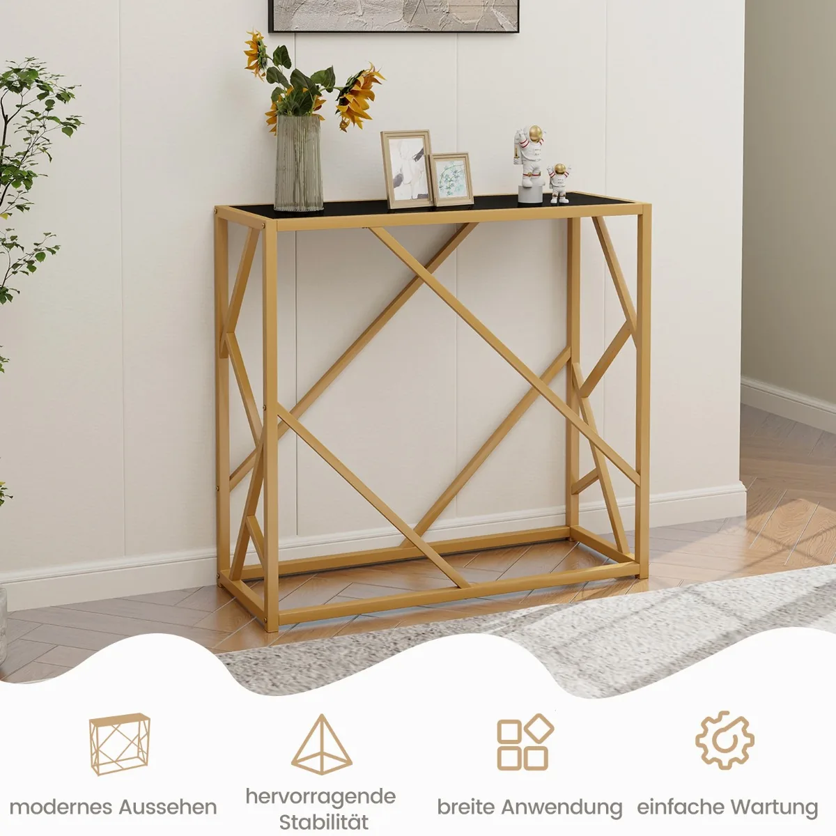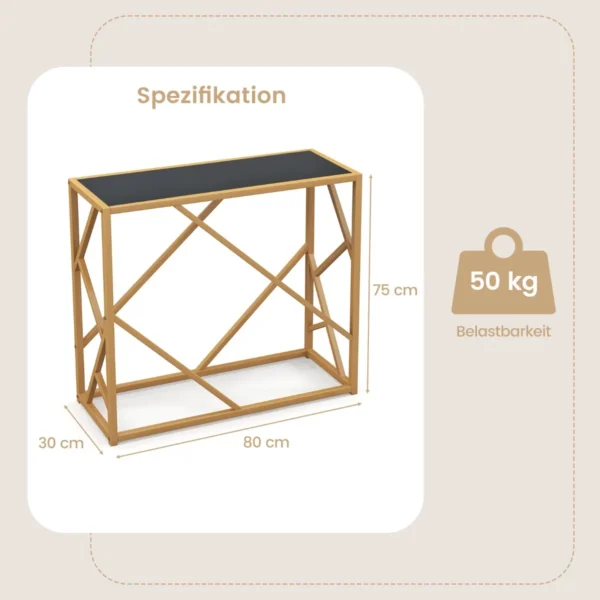 Konsolė 80x30x75cm juodos ir auksinės spalvos – funkcionalus ir tvirtas baldų sprendimas, idealiai tinkantis įvairioms patalpoms. Šis konsolinis stalas turi grūdinto stiklo stalviršį bei metalinį rėmą, užtikrinantį ilgaamžiškumą ir stabilumą.