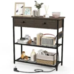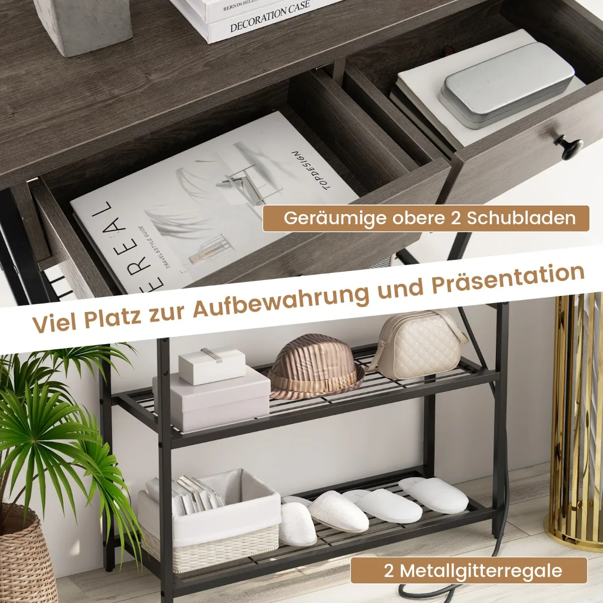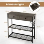 Konsolė 81x30x81cm, tamsiai pilkos ir juodos spalvos, yra funkcionali įėjimo stalo alternatyva, suteikianti pakankamai vietos daiktų laikymui ir eksponavimui. Šis konsolinis stalas pasižymi tvirtu metaliniu rėmu ir praktiškais stalčiais bei lentynomis, kurios padeda palaikyti tvarką jūsų namuose.