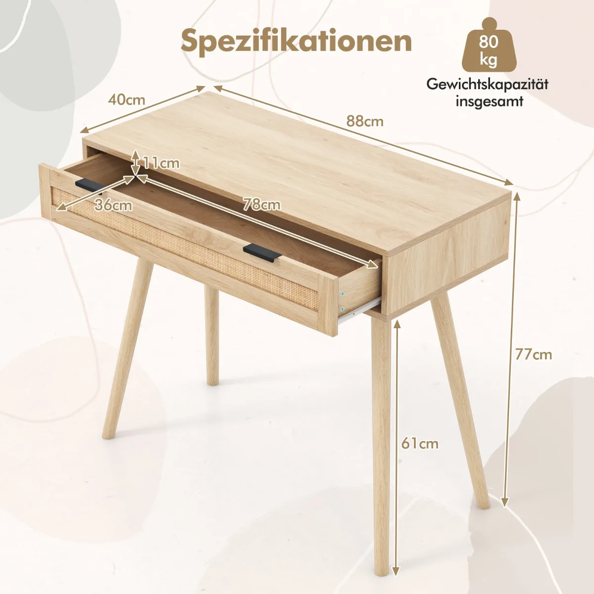 Konsolė 88x40x77cm šviesiai rudos spalvos puikiai tinka įvairioms namų erdvėms. Jos dizainas derina dirbtinės medienos paviršių su rotango detalėmis, suteikdamas natūralų ir funkcionalų sprendimą interjerui. Konsolėje yra erdvus stalviršis ir ištraukiamas stalčius, kas prisideda prie tvarkingos daiktų laikymo.