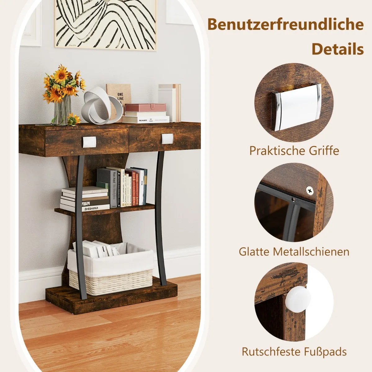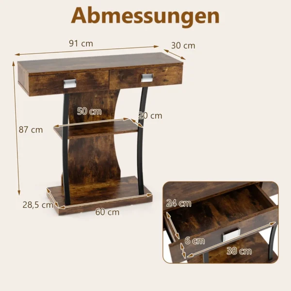 Konsolė 91x30x87 cm, rudos ir juodos spalvos, yra praktiškas sprendimas jūsų namų erdvei. Šis konsolinis stalas turi du stalčius ir dvi lentynas, suteikdamas pakankamai vietos pagalbinėms ir dekoratyvinėms detalėms. Tvirtas metalinis rėmas užtikrina stabilumą ir saugumą naudojant namuose su vaikais ar augintiniais.