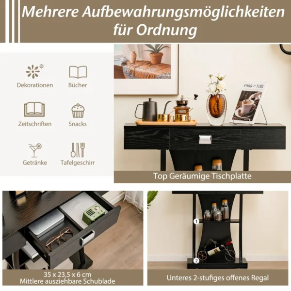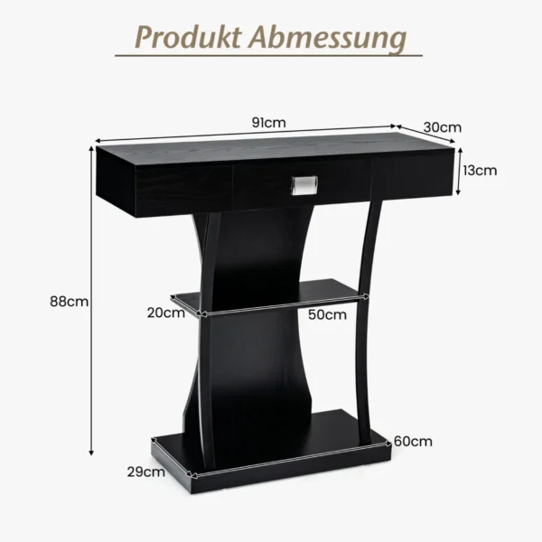 Konsolė 91x30x88cm, juodos spalvos, yra funkcionalus ir erdvus baldas, tinkantis prieškambariui, svetainei ar kitiems namų kambariams. Konsolinis stalas su stalčiumi ir dviejų lygių atvira lentyna leidžia efektyviai išnaudoti saugojimo vietą ir eksponuoti įvairius daiktus. Tvirtas metalinis rėmas bei apsauga nuo apsivertimo užtikrina saugumą ir stabilumą.