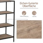 Ar esate pasirengę kūrybiškai rodyti savo kolekcijas? Ši laikymo lentyna yra jūsų idealus pasirinkimas. Unikalus asimetriškas dizainas ir dviejų atspalvių konstrukcija, pasižyminti kaimiškomis ąžuolo drožlėmis ir lygia tamsia mediena, padeda sukurti drąsų bet kokioje aplinkoje. Penkios atviros lentynos suteikia pakankamai vietos daiktams laikyti. Pagaminta iš tvirto metalinio rėmo ir tvirtos P2 medžio drožlių plokštės, jis yra patvarus ir patrauklus bet kurios svetainės ar namų biuro priedas.