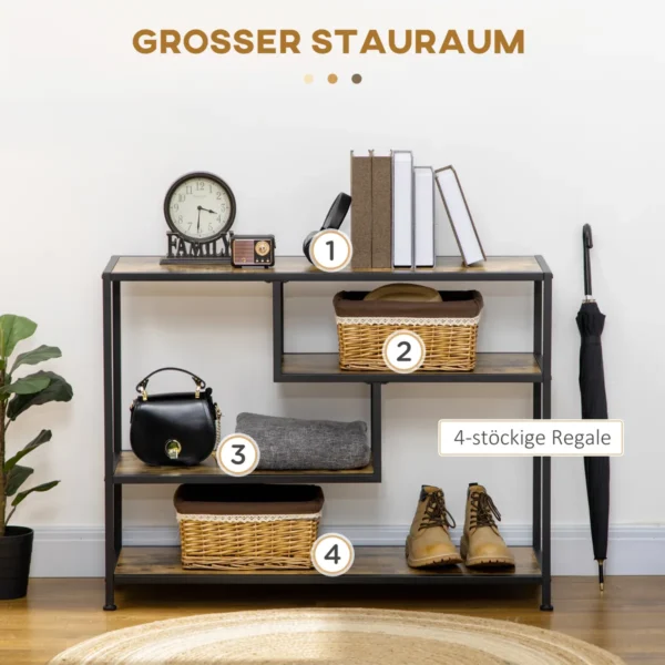 Ar ieškote stilingo saugyklos sprendimo savo įėjimui? Šis konsolinis stalas puikiai tinka jūsų mėgstamoms detalėms. Su 4 atviromis lentynomis jame yra vietos krepšiams, raktams ir asmeniniams daiktams. Pagaminta iš tvirto plieno ir medžio drožlių plokštės, yra patvari ir lengvai prižiūrima. Prieškambario stalo dizainas, apsaugantis nuo virtimo, suteikia papildomo stabilumo. Suteikite industrinio žavesio savo prieškambariui, svetainei ar miegamajam.