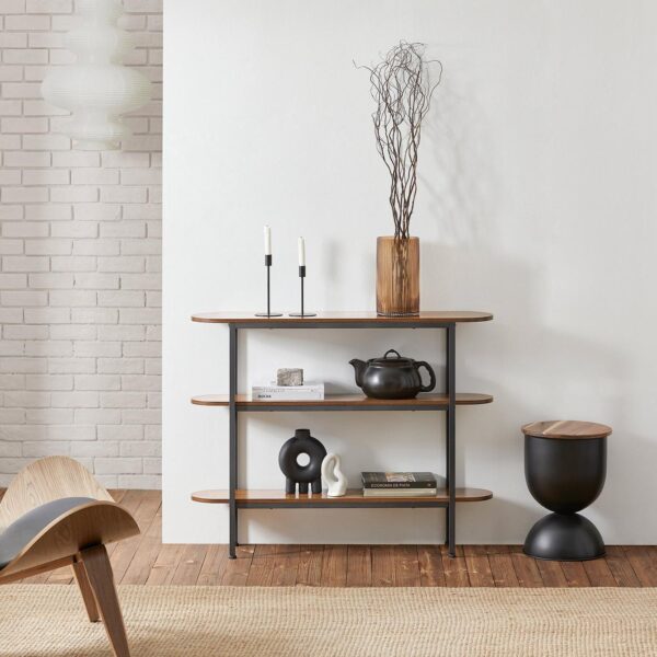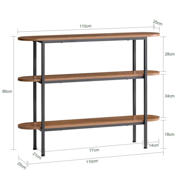 Konsolinis stalas 110x25x86 cm, rudos/juodos spalvos, yra puikus pasirinkimas jūsų namų interjerui. Šis stalas puikiai tinka tiek prieškambariui, tiek svetainei, suteikdamas elegancijos ir funkcionalumo.