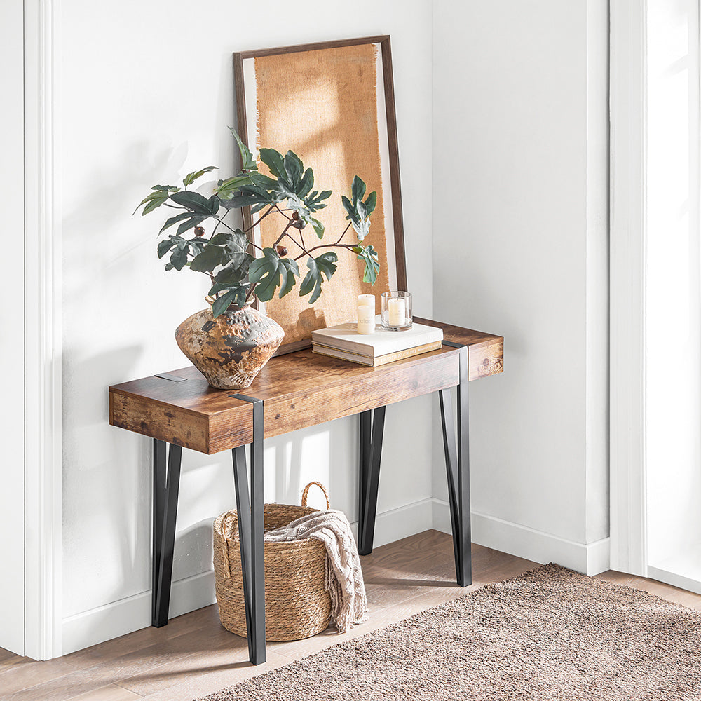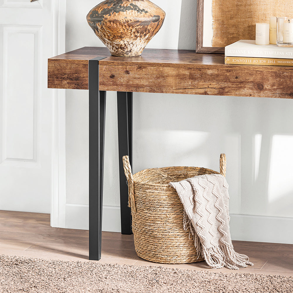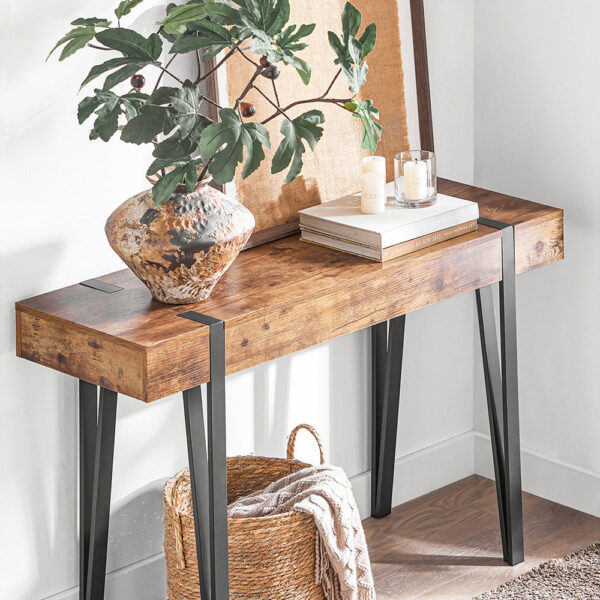 Konsolinis stalas 120x40x75 cm, juodos/rudos spalvos, yra puikus pasirinkimas jūsų interjerui. Jis gali būti naudojamas kaip konsolinis stalas, kavos staliukas, prieškambario stalas ar net miegamajame, svetainėje ar biure kaip vietą taupantis laikymo stalas.