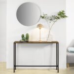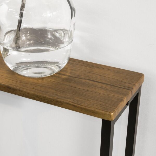 Konsolinis stalas 120x20x80 cm, juodos/rudos spalvos, yra puikus pasirinkimas jūsų namų interjerui. Jo medinė viršutinė dalis suteikia šilumos ir rustiškumo, o dizainas leidžia lengvai pritaikyti stalą įvairiems poreikiams ir derinti su kita interjero įranga.